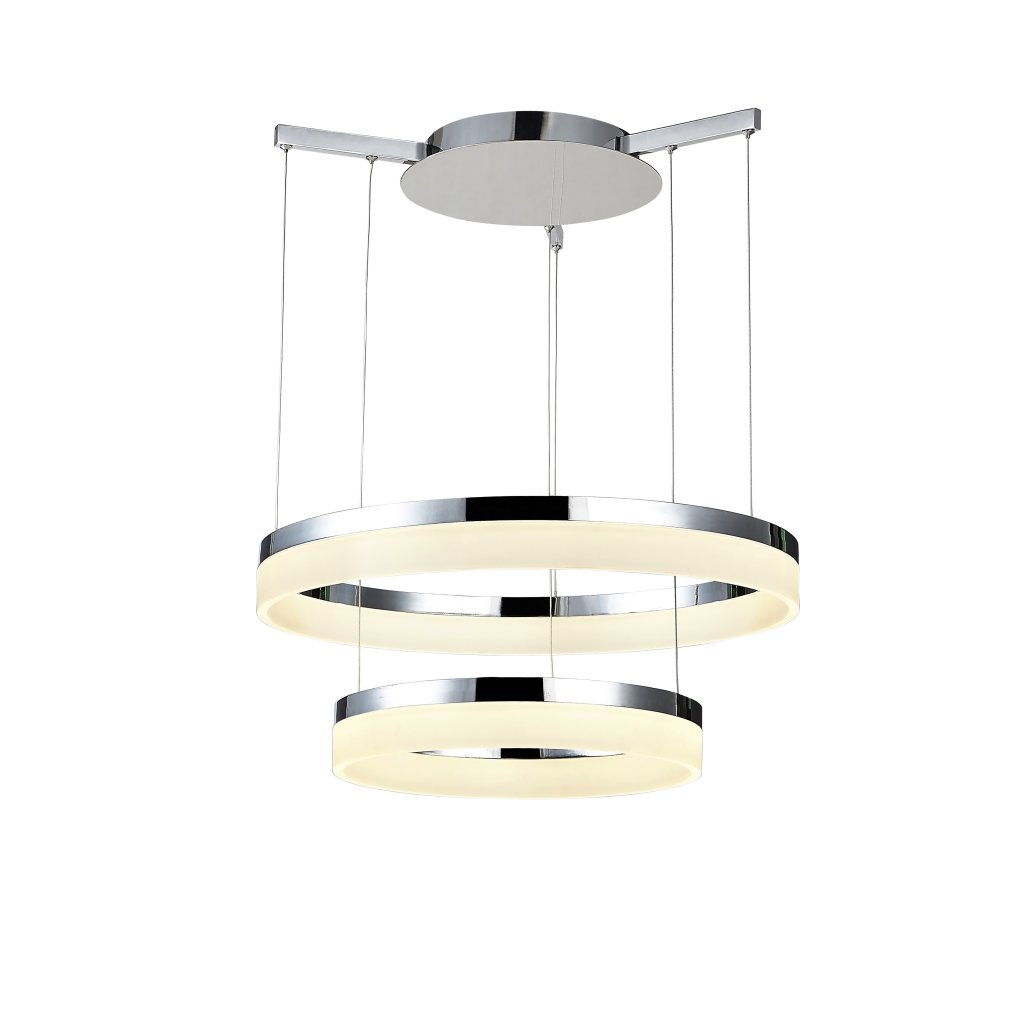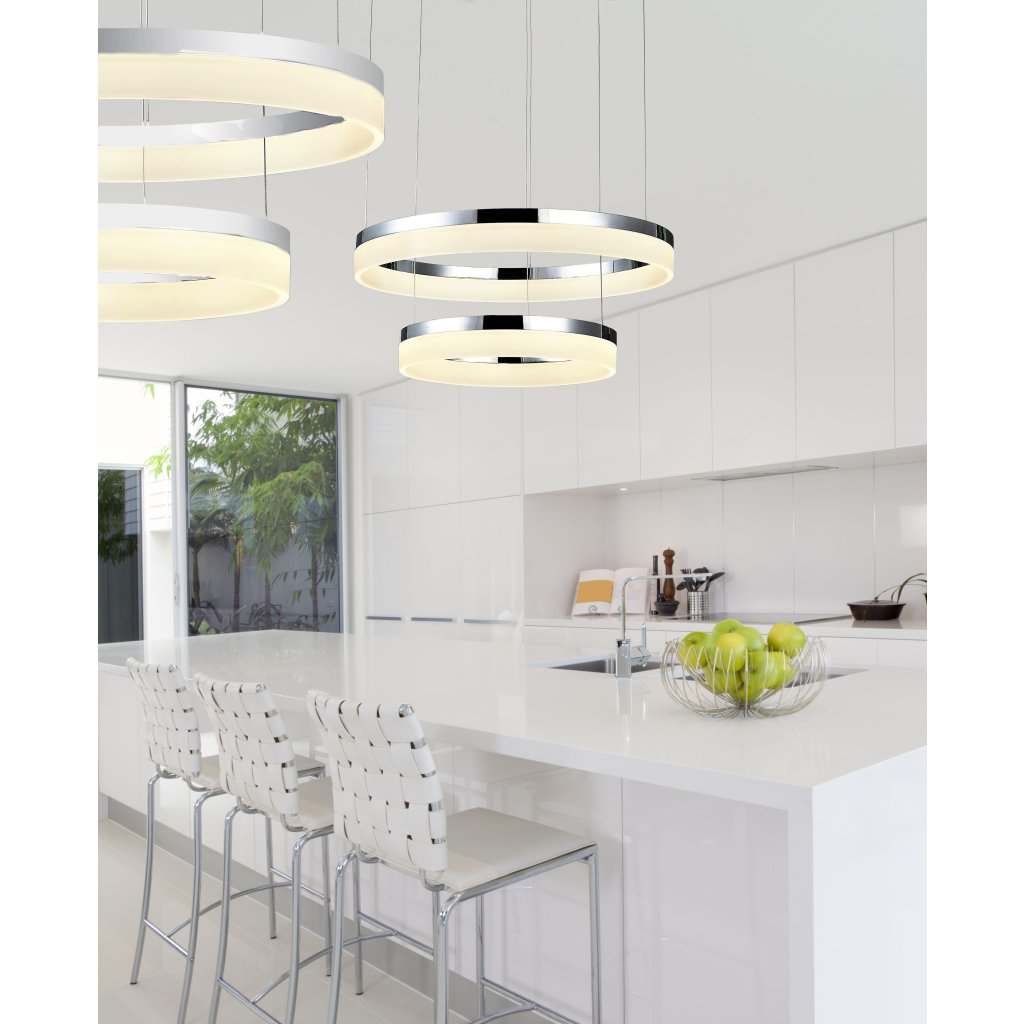 Moderní závěsné LED svítidlo Zola v menší chromové variantě rozsvítí díky svým dvěma světelným prstencům o průměrech 60 cm a 40 cm obývací místnost jako hlavní osvětlení. Vydává silné, avšak neoslňující teplé bílé světlo 3000 K se světelným tokem 4200lm.