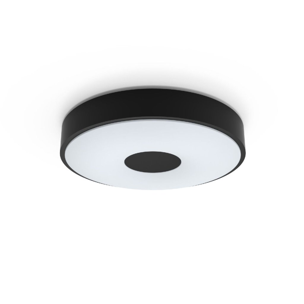 Stropní černé LED svítidlo Philips COINER s technologií Scene Switch o velikosti 38,9 cm a celkovém příkonu 24 W, jehož jasný bílý svit s teplotou chromatičnosti 4000 K můžete krokově stmívat ve třech úrovních pomocí standardního nástěnného vypínače.