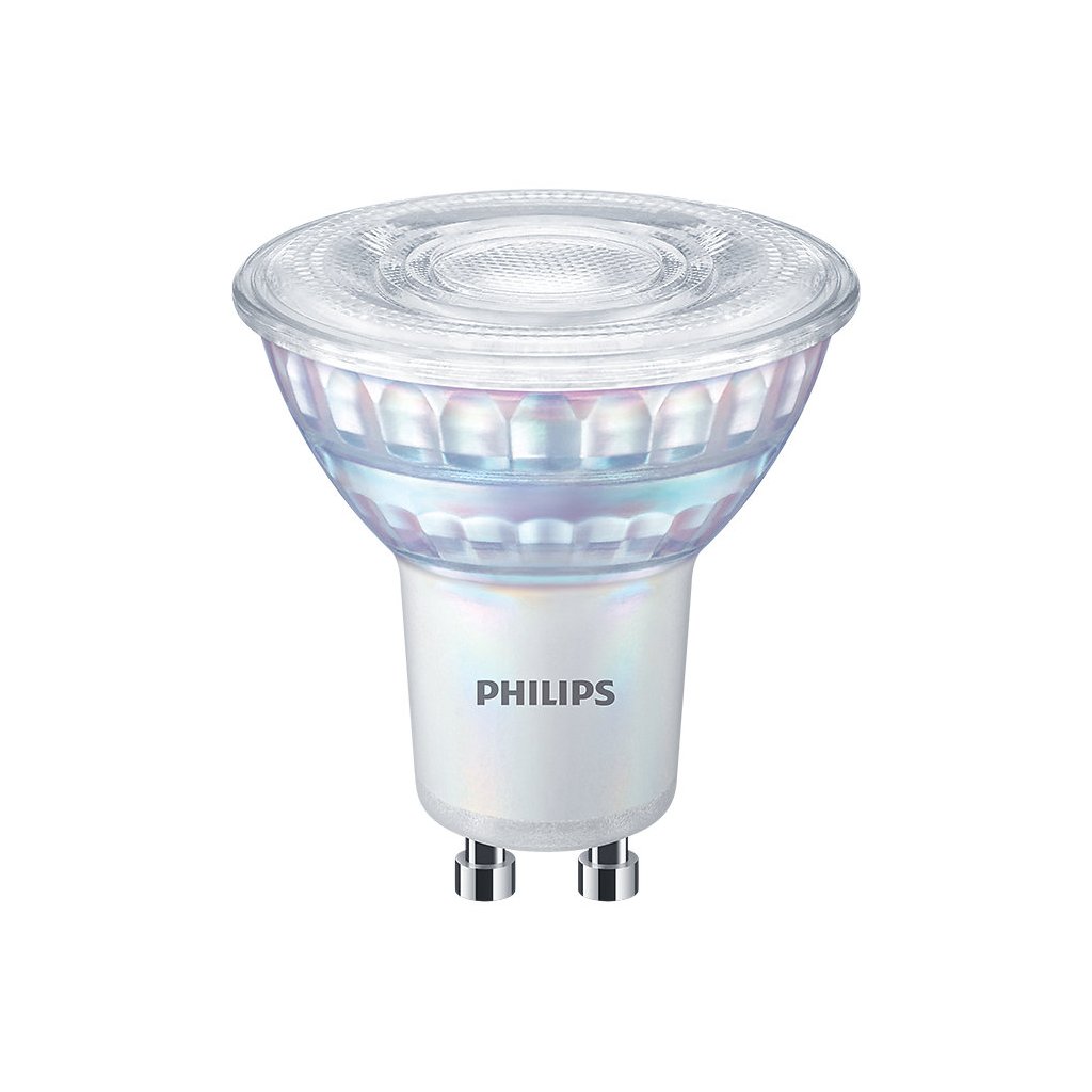 Spotová stmívatelná LED žárovka Philips CorePro LEDspot MV s paticí GU10 má příkon 3 W a nahrazuje svit 35 W halogenové žárovky. Vydává úzký kužel teplého bílého světla 3000 K pod úhlem 36° se světelným tokem 230 lm.