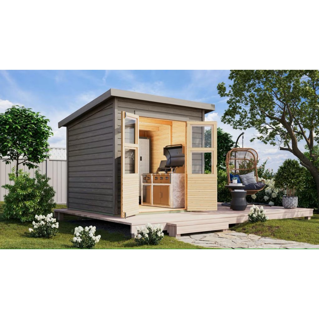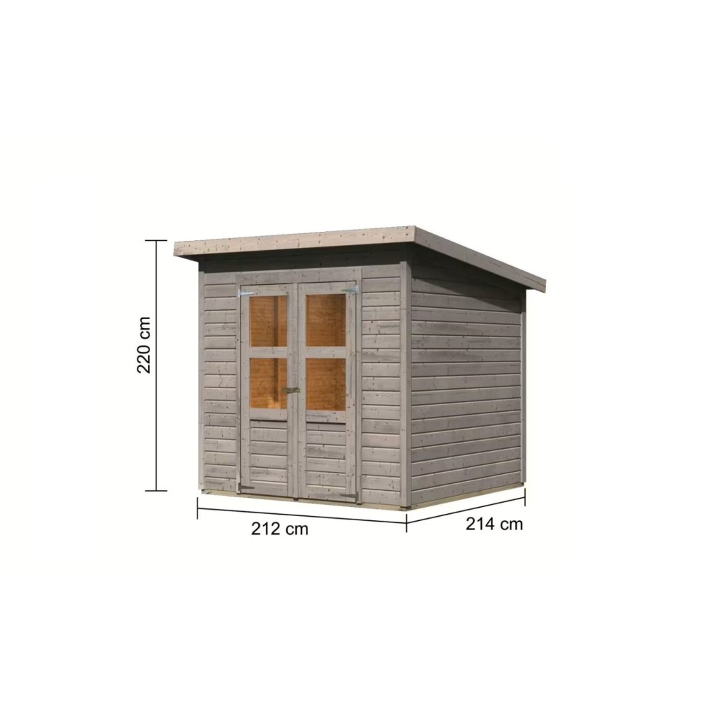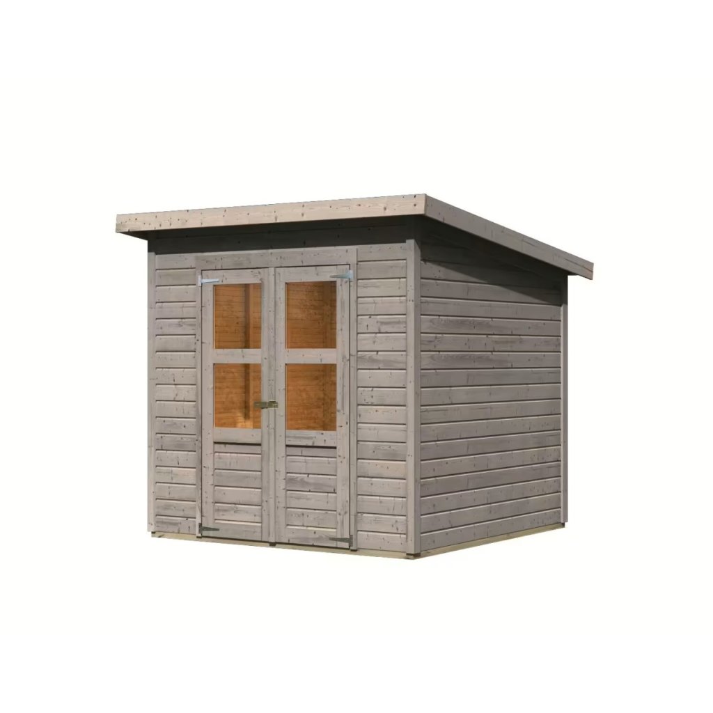 Tento model domku dodáváme v profesionálním nátěru KARIBU (odstín světle šedé RAL 360 60 05):