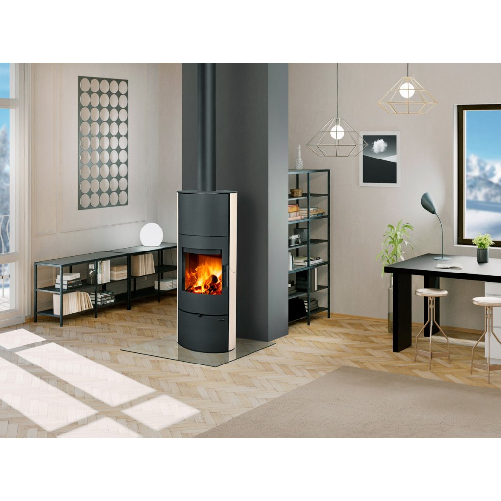 Štíhlá vysoká akumulační kamna EVORA H s oblíbenou oválnou základnou a s vysokou schopností sálat dodatečné teplo.