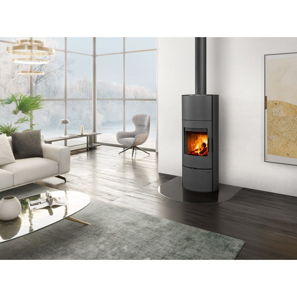 Štíhlá vysoká akumulační kamna EVORA H s oblíbenou oválnou základnou a s vysokou schopností sálat dodatečné teplo.