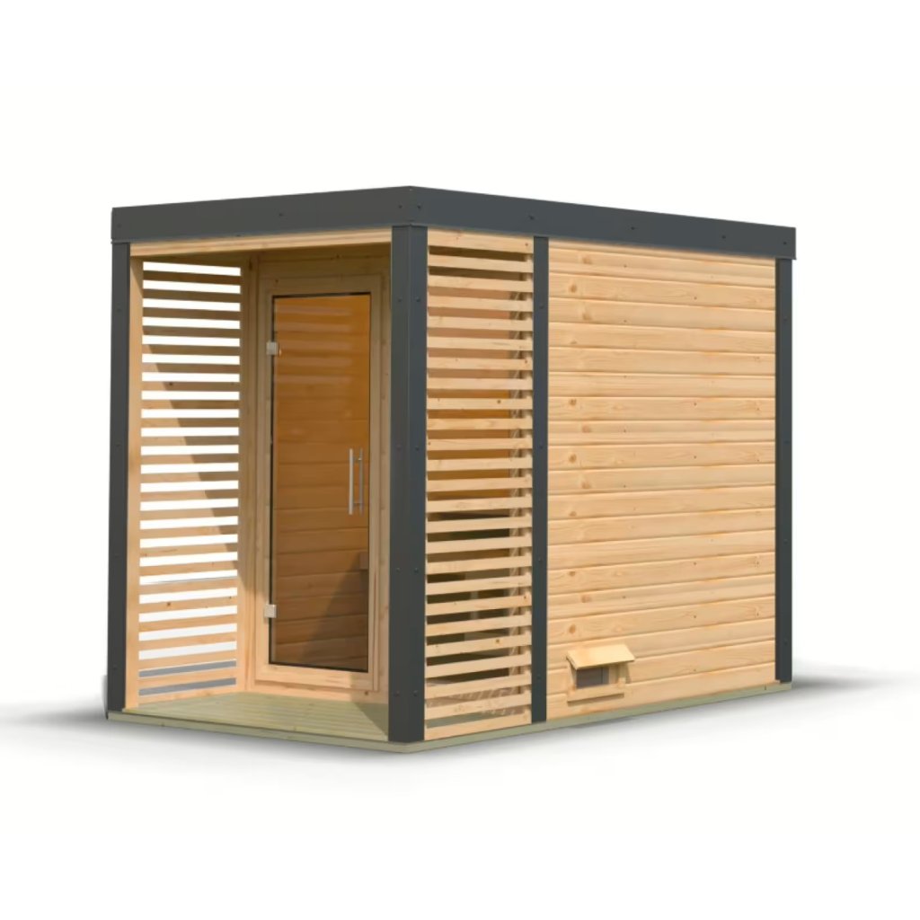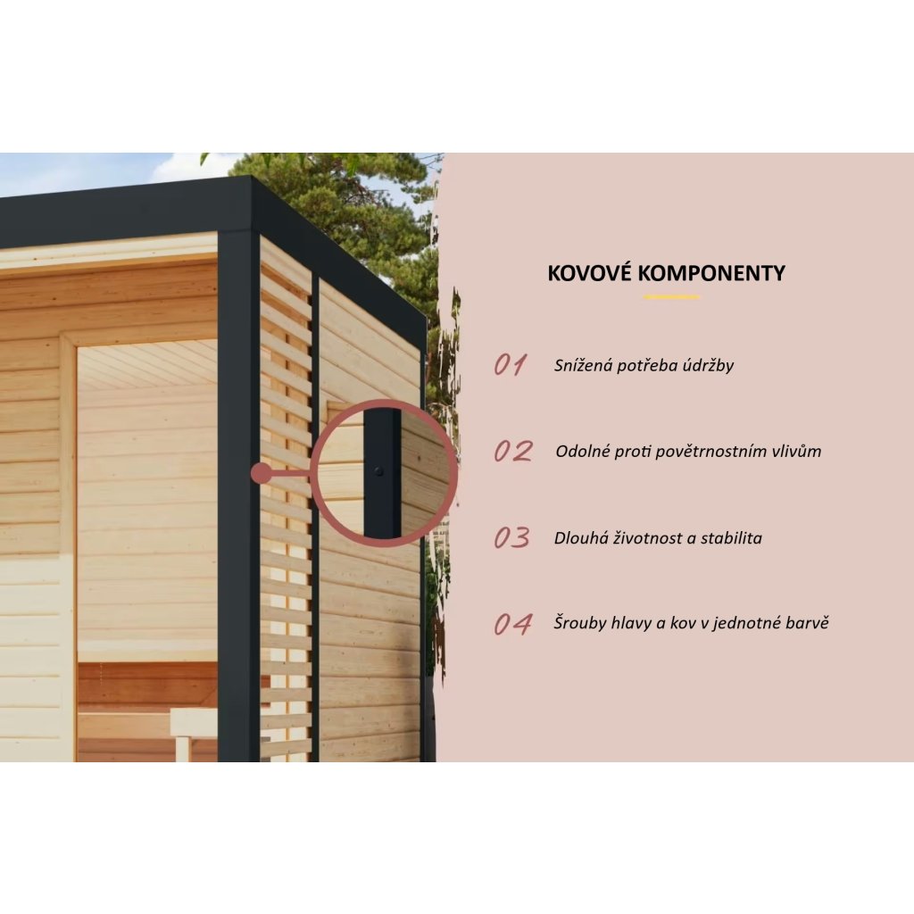 - barva: přírodní dřevo (sauna) + antracitové oplechování