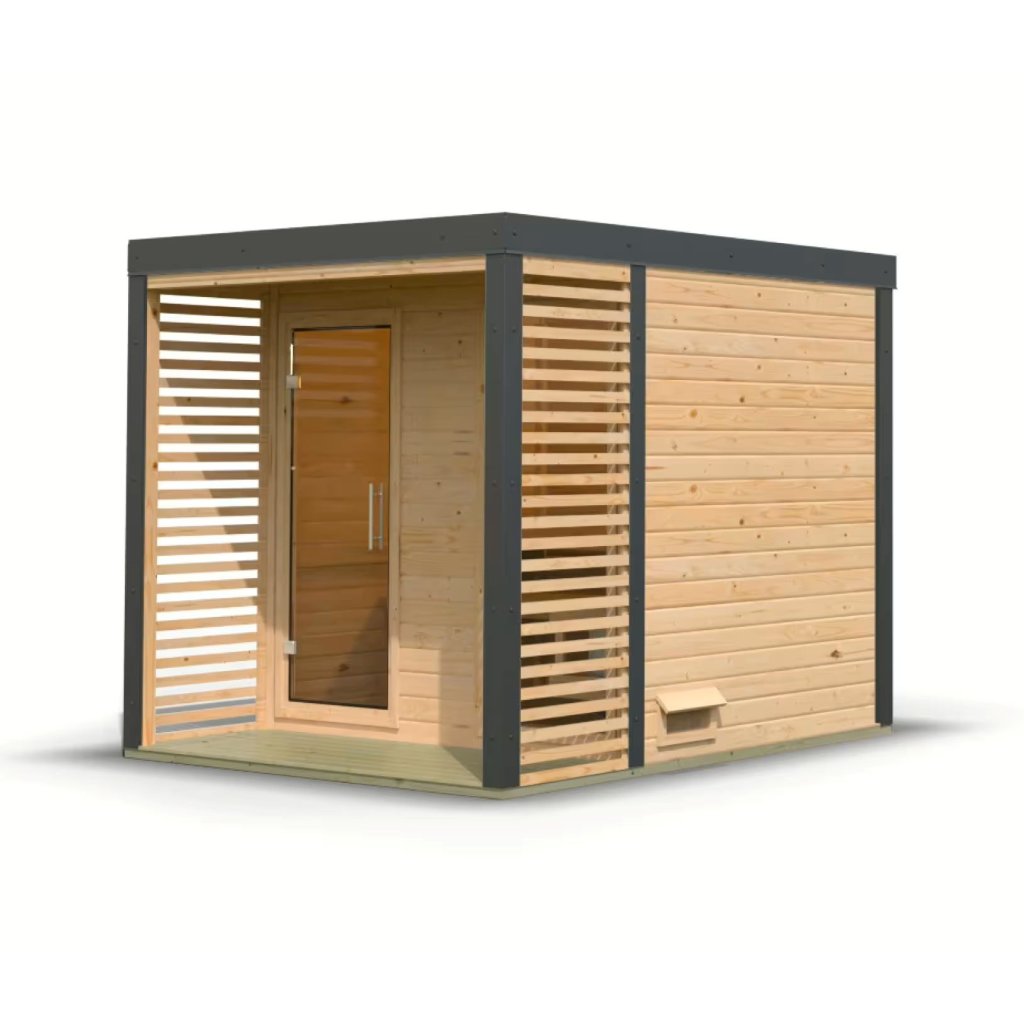 - barva: přírodní dřevo (sauna) + antracitové oplechování