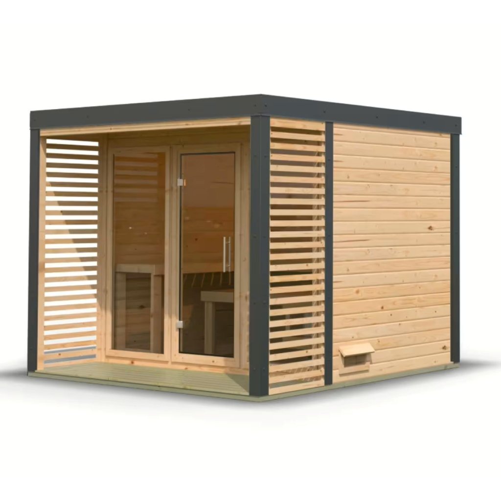 - barva: přírodní dřevo (sauna) + antracitové oplechování