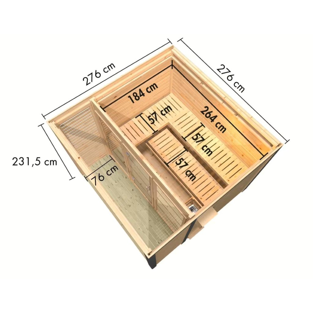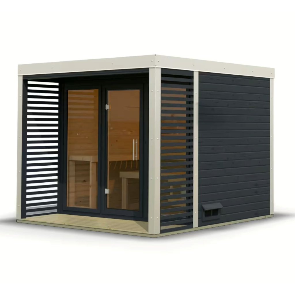 Naše sauna ARES 3 kombinuje přírodní krásu severského smrku s moderními ocelovými prvky pro maximální ochranu. Stěny o tloušťce 38 mm, strop s izolací z minerální vlny a masivní dřevěná konstrukce zajišťují vynikající tepelnou izolaci. Vnější rozměry š 276 x h 276 cm a tři pohodlné lavice nabízí dostatek prostoru pro relaxaci. Kvalitní plochá střecha chrání konstrukci i za nepříznivého počasí, zatímco impregnované podlahové trámy s dřevěnou podlahou chrání proti vlhkosti. Sauna je dostupná v různých barevných kombinacích, které si můžete přizpůsobit podle svého vkusu. Dodáváme jako stavebnici v rozloženém stavu, kde stěny tvoří jednotlivé dřevěné profily, které pouze sesadíte k sobě a sešroubujete. To garantuje jednoduchou montáž, kterou zvládne každý domácí kutil.