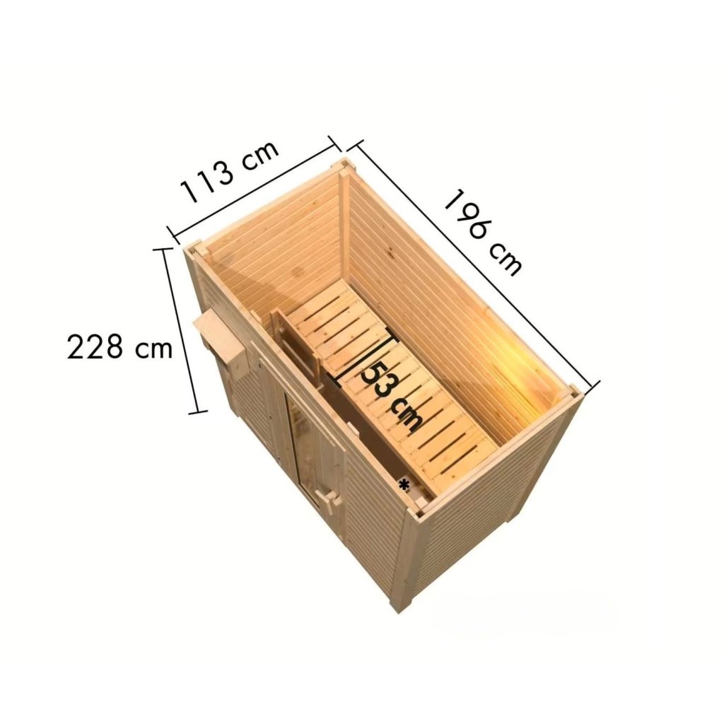 Venkovní model finské sauny pro vaši zahradu. Sauna je určená pro 2 sedící osoby. Její výrobce, firma KARIBU HOLZTECHNIK z německých Brém, dokázala svými výrobky úspěšně navázat na staletou tradici skandinávského saunování a současně do ní zapracovat dnešní moderní technologie. Dodáváme jako stavebnici v rozloženém stavu, kde stěny tvoří jednotlivé dřevěné profily, které pouze sesadíte k sobě a sešroubujete. To garantuje jednoduchou montáž, kterou zvládne každý domácí kutil. Stěny sauny jsou složeny ze speciálně hlazených prken s dvojitým perem a drážkou, což garantuje neobyčejnou pevnost spoje.
