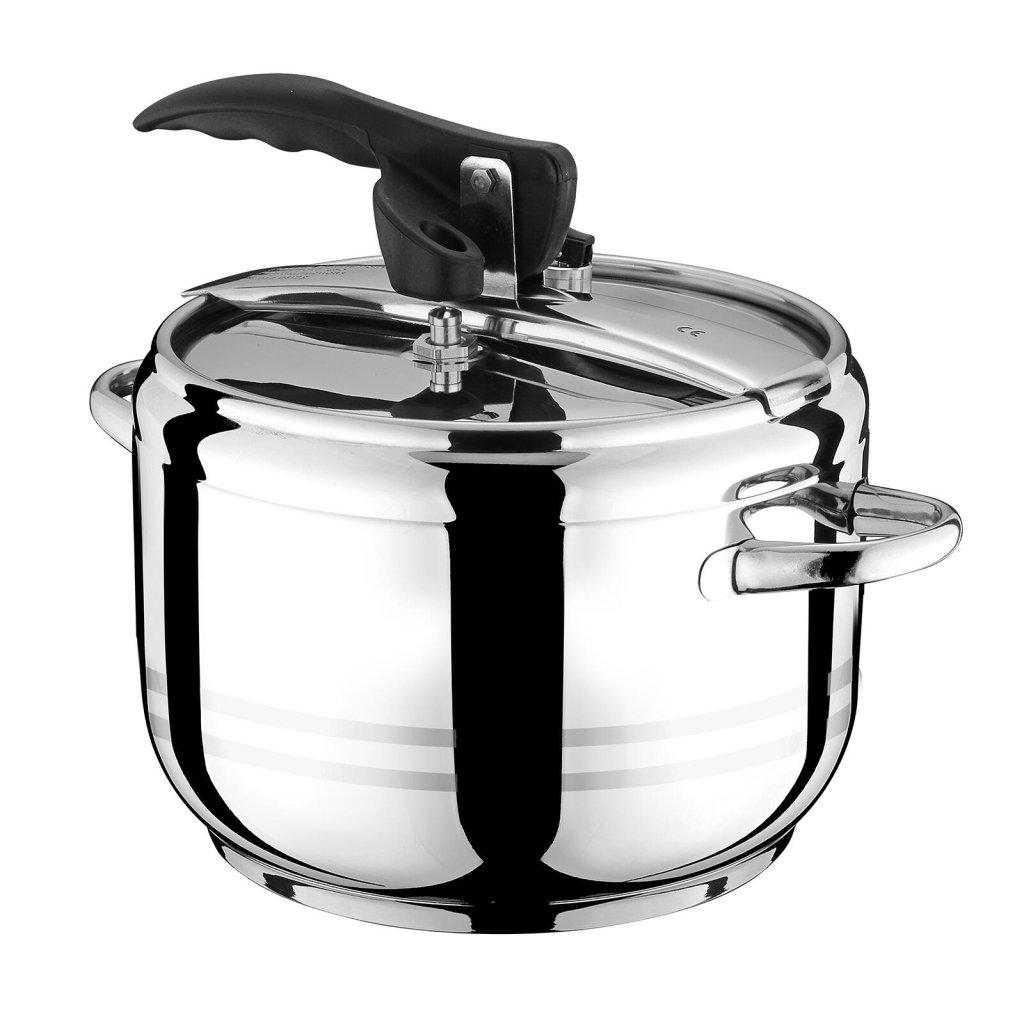 Nerezový tlakový hrnec s pákovým uzávěrem.