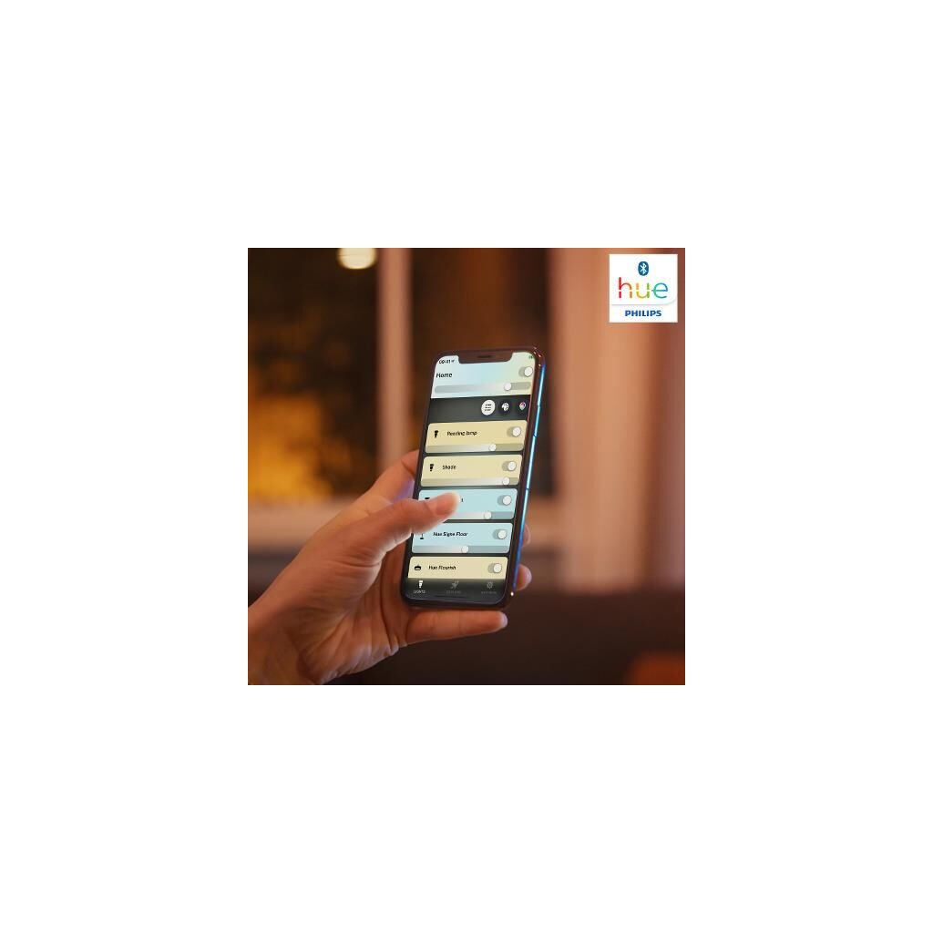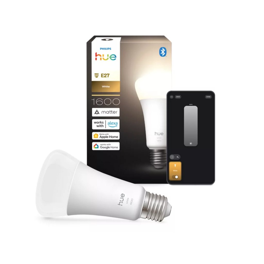 Smart LED žárovka Philips Hue W s paticí E27 ve větší velikosti s tvarem baňky A21 o příkonu 1 x 13,5 W, která vydává stmívatelné měkké teplé bílé světlo 2700 K se světelným tokem 1600 lm, které lze jednoduše připojit přes Hue Bridge a ovládat její svit přes Bluetooth, aplikací či hlasem.