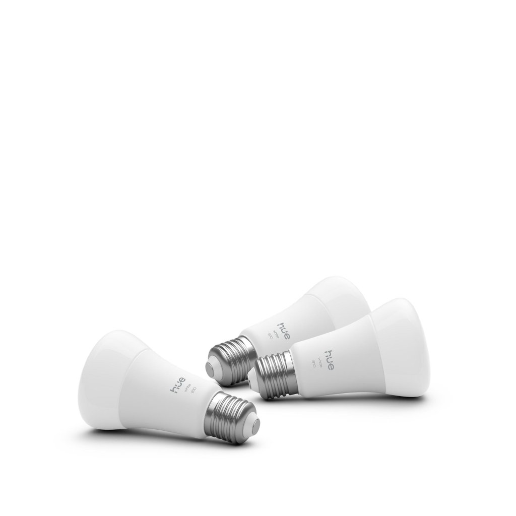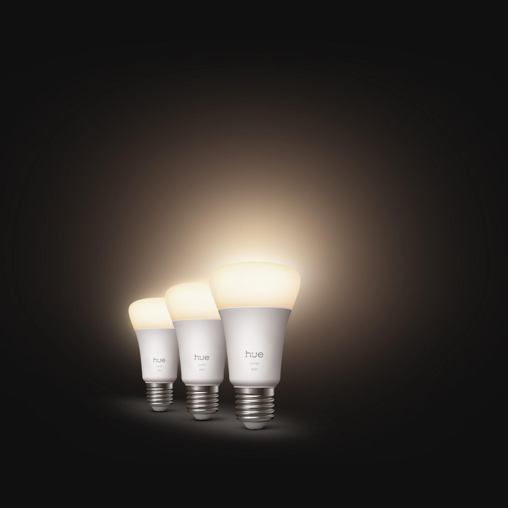 Set 3 ks chytrých LED žárovek Philips Hue W s paticí E27 o příkonu 3 x 7 W, které vydávají stmívatelné měkké teplé bílé světlo 2700 K se světelným tokem 810 lm, které lze jednoduše připojit přes Hue Bridge, ovládat jejich svit přes Bluetooth, apikací či hlasem.