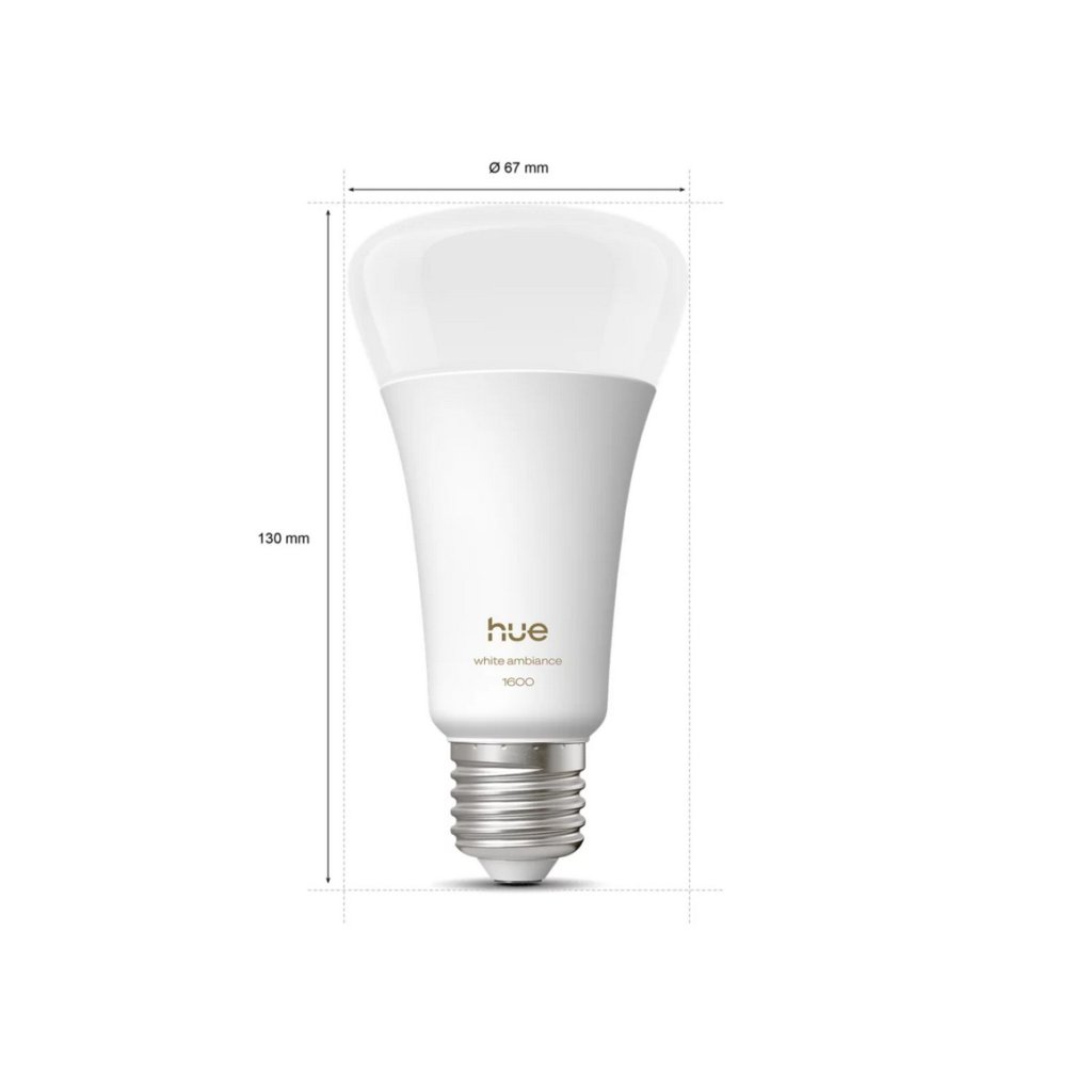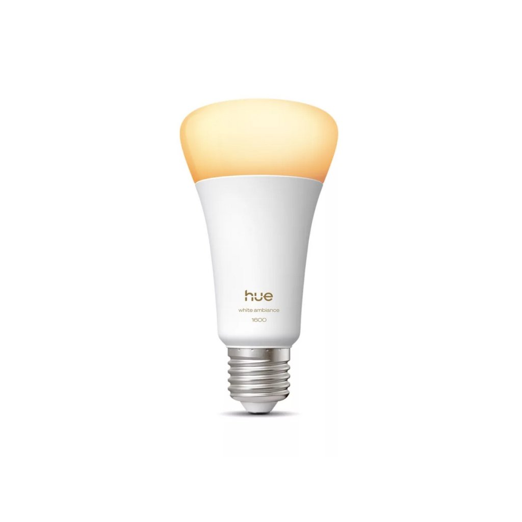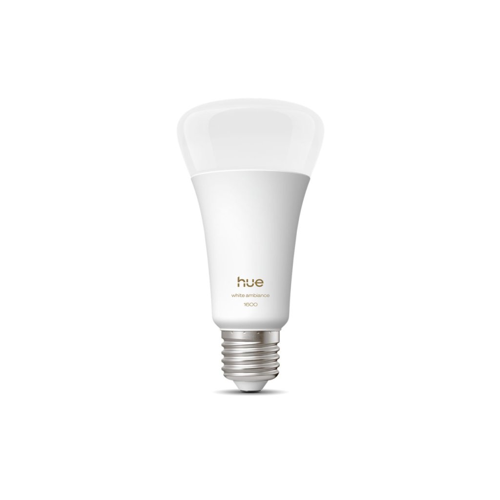 Smart LED žárovka Philips Hue WA s paticí E27 s tvarem vyšší baňky A21 o příkonu 1 x 15 W, která svítí stmívatelným bílým světlem s možnou změnou širokého spektra odstínu bílého svitu od 1000 K až po 20000 K se světelným tokem 1600 lm (při 4000 K), kterou lze jednoduše připojit přes Hue Bridge a ovládat její svit přes Bluetooth, aplikací či hlasem.