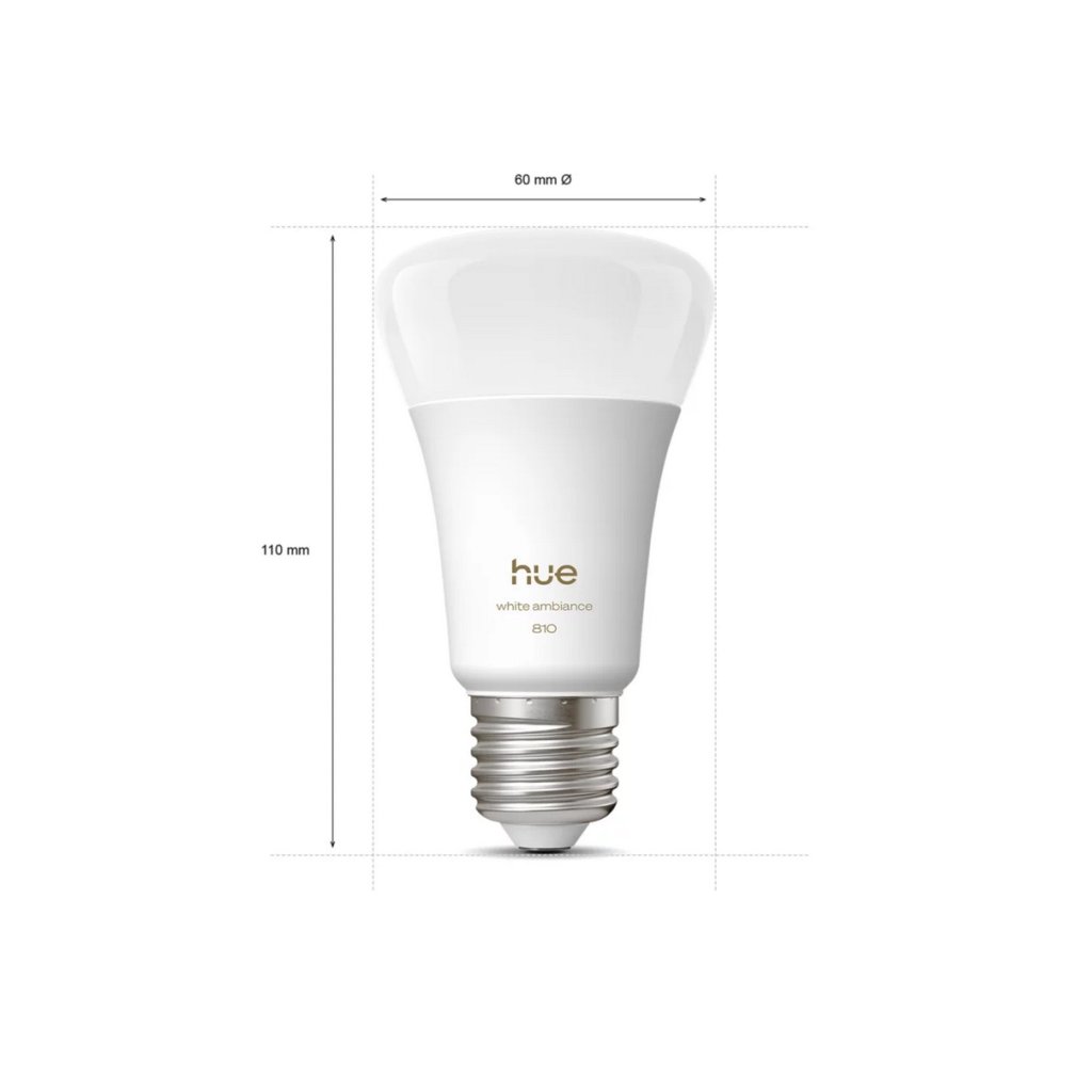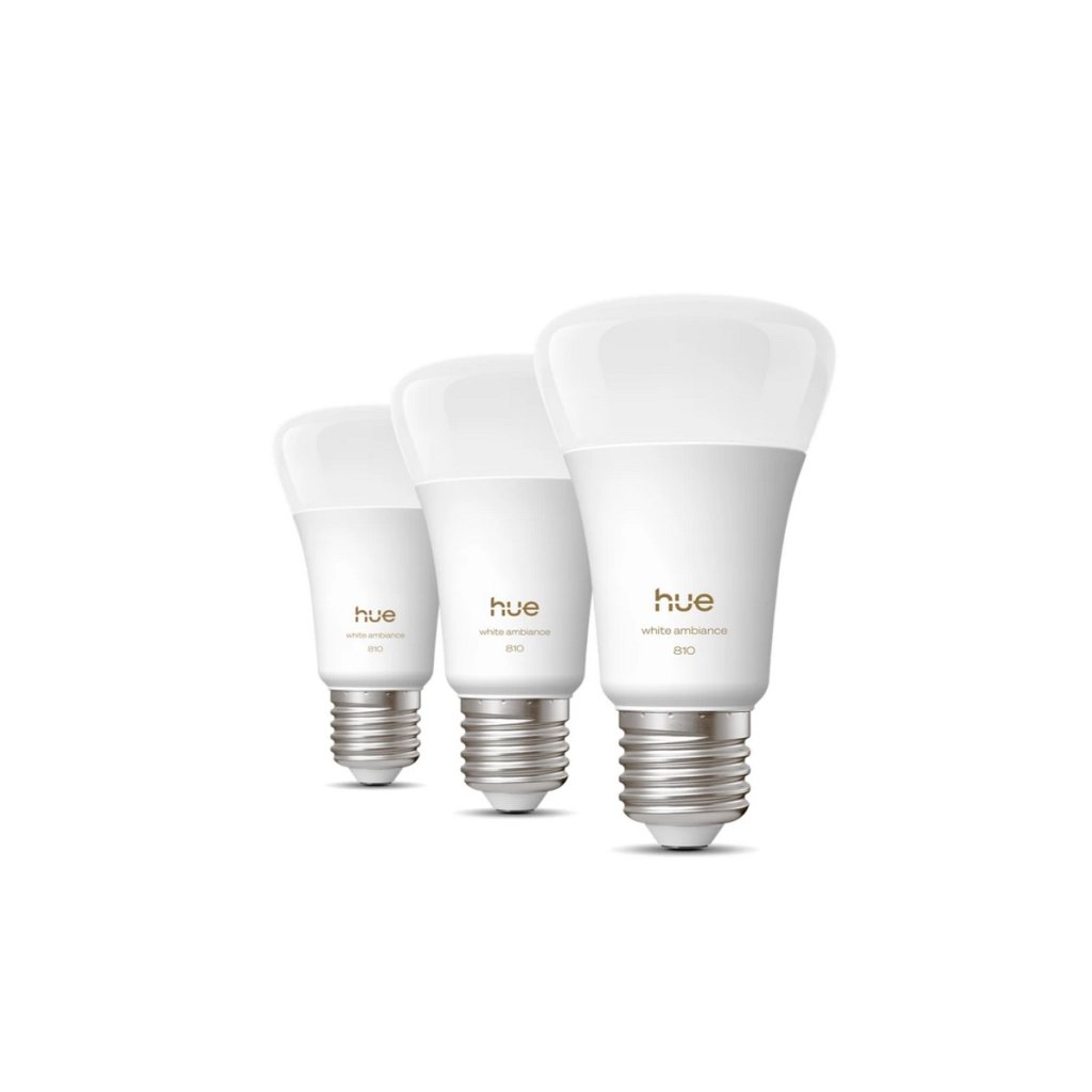 Sada 3 ks smart LED žárovek Philips Hue WA s paticí E27 s tvarem baňky A19 o příkonu 3 x 8 W, které vydávají stmívatelné bílé světlo s možnou změnou širokého spektra odstínu bílého svitu od 1000 K až po 20000 K se světelným tokem 810 lm (při 4000 K), které lze jednoduše připojit přes Hue Bridge a ovládat jejich svit přes Bluetooth, aplikací či hlasem.