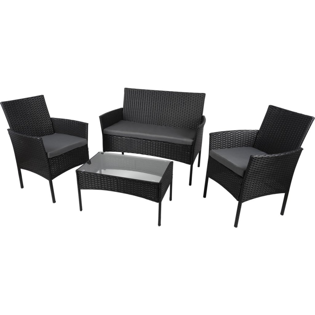 Univerzální zahradní nábytek ve 4 dílech v elegantním černém ratanu, ideální pro venkovní odpočinek na vaší zahradě, balkóně nebo terase. Obsahuje dvě křesla, pohovku a stůl se skleněnou deskou.