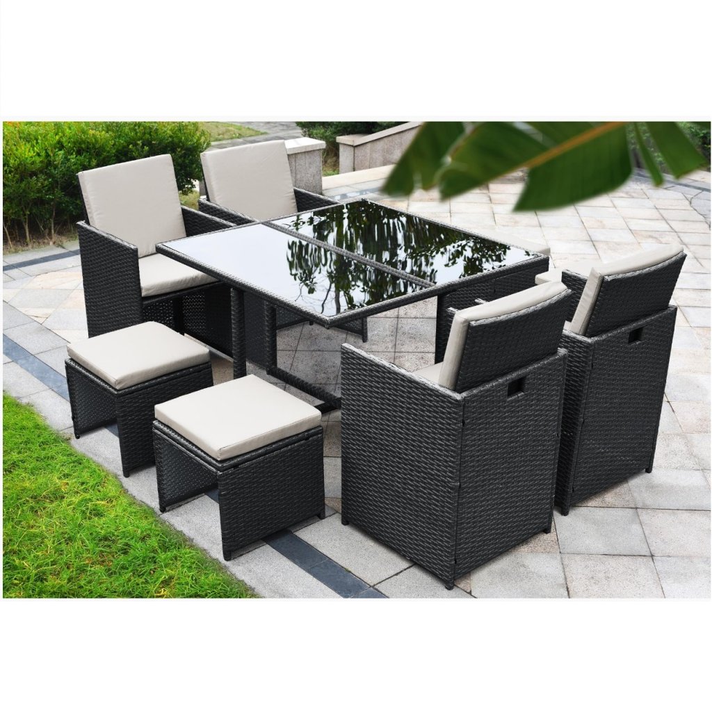 Univerzální zahradní nábytek v elegantním černém ratanu, ideální pro venkovní odpočinek na vaší zahradě, balkóně nebo terase. Obsahuje čtyři křesla, čtyři taburety a stůl.