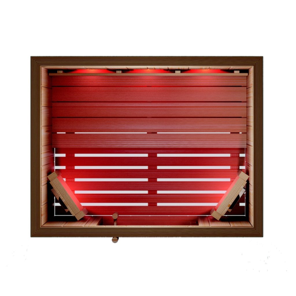 - 6x redlight topidlo (3x záda, 1x přední zleva, 1x přední zprava, 1x pod lavicí) s extra velkými parabolickými zrcadly pro maximalizaci výkonu a pro ideální nasměrování širokospektrální infračervené záření typu - IR-A, IR-B a IR-C