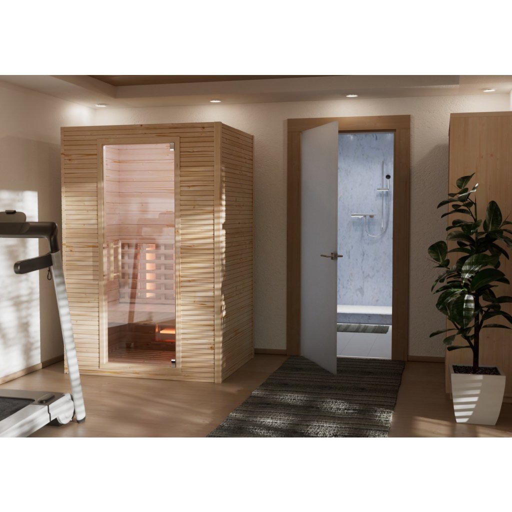 Infrasauna od německého výrobce RORO GmbH, typ MATTERHORN je určena pro 2 osoby a je ideální volbou pro ty, kteří hledají pohodlný a efektivní způsob, jak si užít saunování přímo u sebe doma. Díky svému modernímu a univerzálnímu designu se hodí do jakéhokoli prostoru – ať už v bytě nebo v rodinném domě. Sauna je vyrobena z kvalitního smrkového dřeva, což jí zajišťuje nejen skvělý vzhled, ale i dlouhou životnost a odolnost. Tato infrasauna je navržena tak, aby byla snadno ovladatelná a vyžadovala minimální údržbu. S technologií, která zaručuje rovnoměrné rozložení tepla a možnost nastavení teploty, si užijete intenzivní prohřátí těla a podpoříte krevní oběh. Je skvělým řešením pro ty, kteří chtějí zlepšit svou fyzickou kondici a zároveň si dopřát chvíle pohody a relaxace. Pravidelný pobyt v infrasauně má pozitivní účinky na zdraví – pomáhá zmírnit bolest, zlepšuje flexibilitu kloubů, zvyšuje prokrvení a má protizánětlivý účinek. Navíc může zlepšit vaši psychickou pohodu, snížit svalové napětí a podpořit kardiovaskulární systém. Infrasauna je skvělé řešení i pro ty, kdo nemohou využívat klasickou saunu kvůli zdravotním problémům. Díky jednoduchému ovládání a efektivnímu využití prostoru je infrasauna RORO MATTERHORN skvělou volbou pro každého, kdo chce snadno a pohodlně využívat výhody saunování bez složitých příprav.