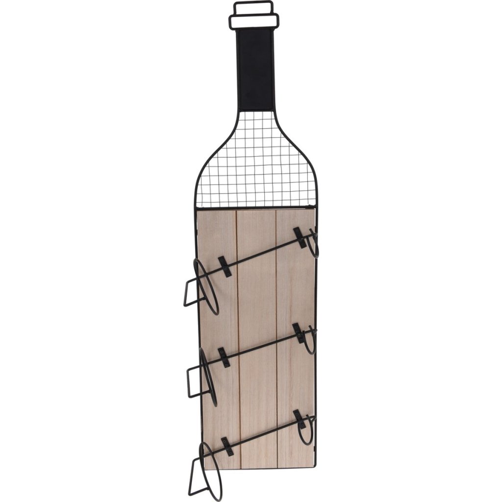 Elegantní stojan určený k zavěšení na zeď na 3 lahve vína. Stojan je vyhotoven v kombinaci kovu (opatřen černou práškovou barvou) i dřeva a je vkusným doplňkem nejen moderních interiérů. Ušetří vám místo při skladování lahví. Budete je mít snadno dostupné a přehledně srovnané. Můžete do stojanu vkládat i jiné předměty jako třeba časopisy apod. Na zadní straně jsou 2 závěsy určené k zavěšení na 2 háčky.