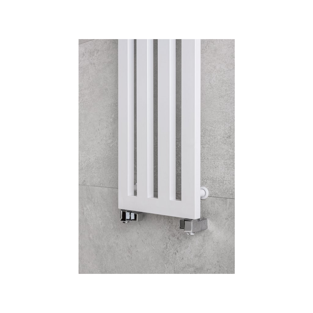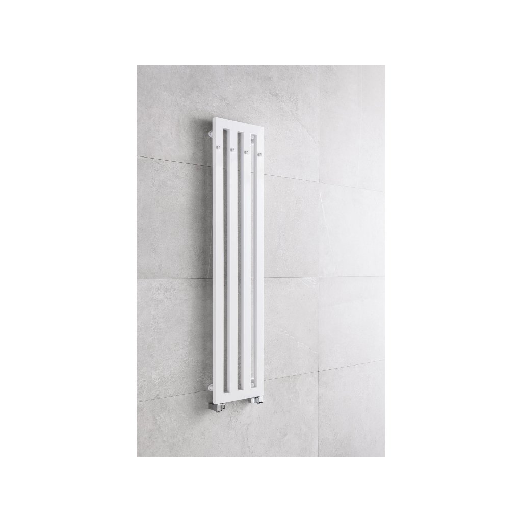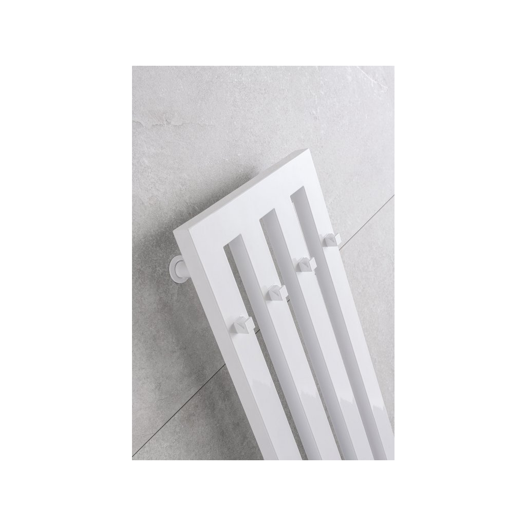 Hranatý radiátor do koupelny s háčky, vhodný i pro kombinované vytápění.