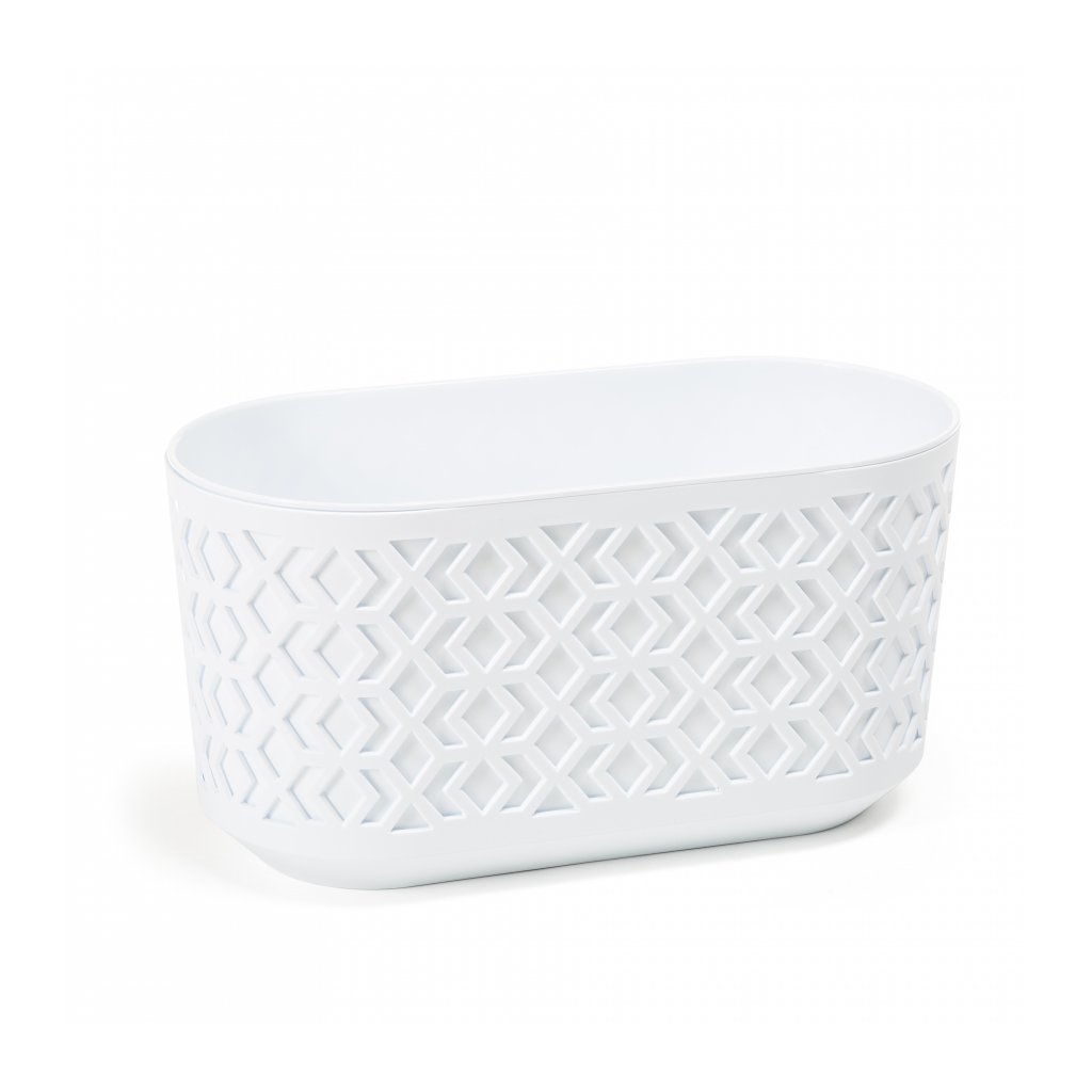 Truhlík (vklad) i obal (děrovaný květináč) mají bílou barvu. Truhlík je odolný vůči běžným škrábancům.