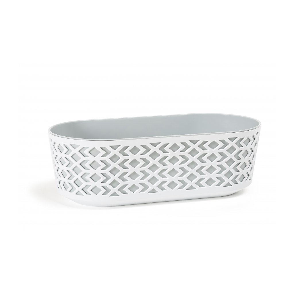Truhlík (vklad) má šedou barvu, obal (děrovaný truhlík) je v bílé barvě (krémovo/bílá).