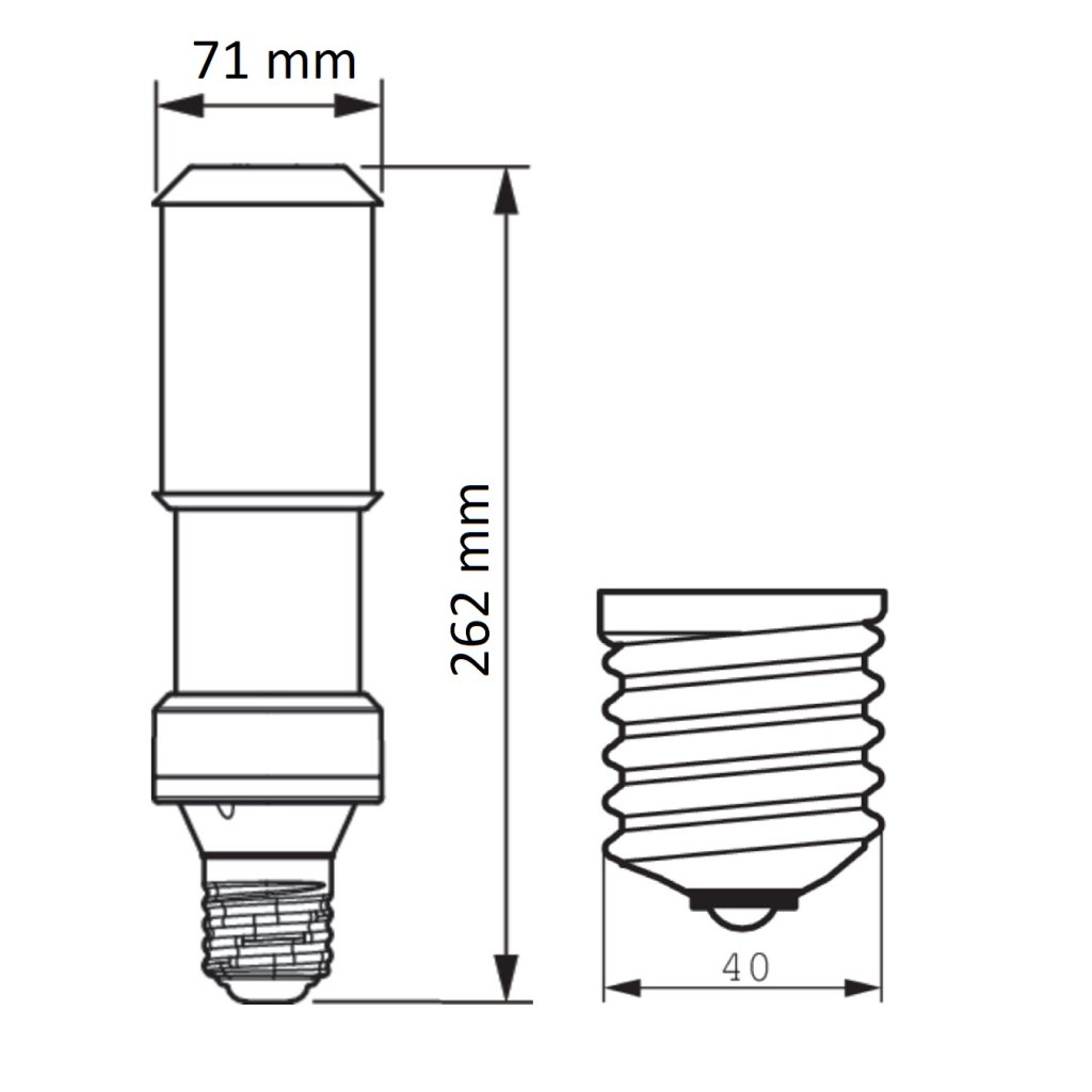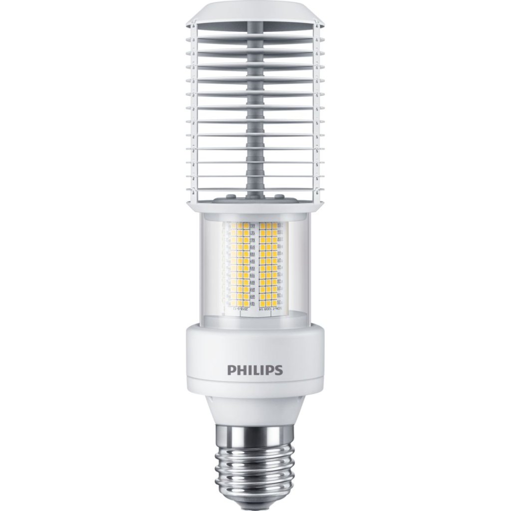 LED náhrada sodíkové výbojky SON a SON-T 100 W pro svítidla veřejného osvětlení prémiové řady Philips Master LED Premium s paticí E40 a příkonem 50 W vydává jasné neutrální denní bílé světlo 4000 K se světelným tokem 9000 lm.