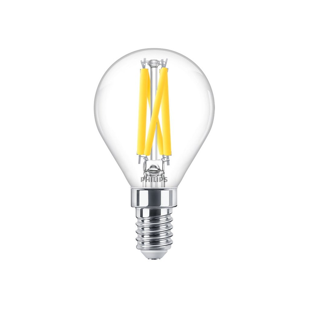 Stmívatelná LED žárovka Philips Master LEDLuster s paticí E14 a skleněnou čirou baňkou CL ve tvaru kapka P45 o příkonu 3,4 W nahrazuje tradiční 40 W žárovky. Vydává krásné teplé bílé světlo s možností regulace stmívačem v rozsahu 2700 K – 2200 K.