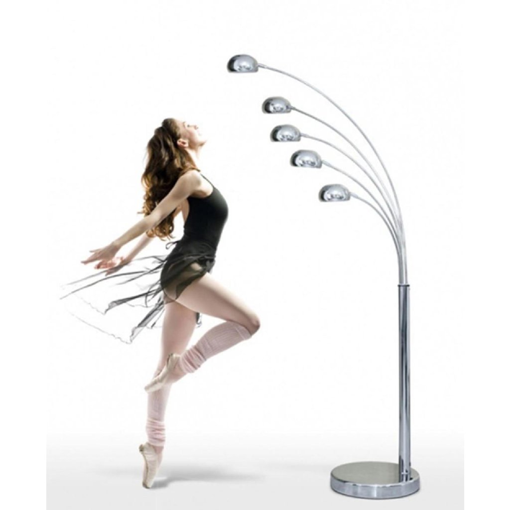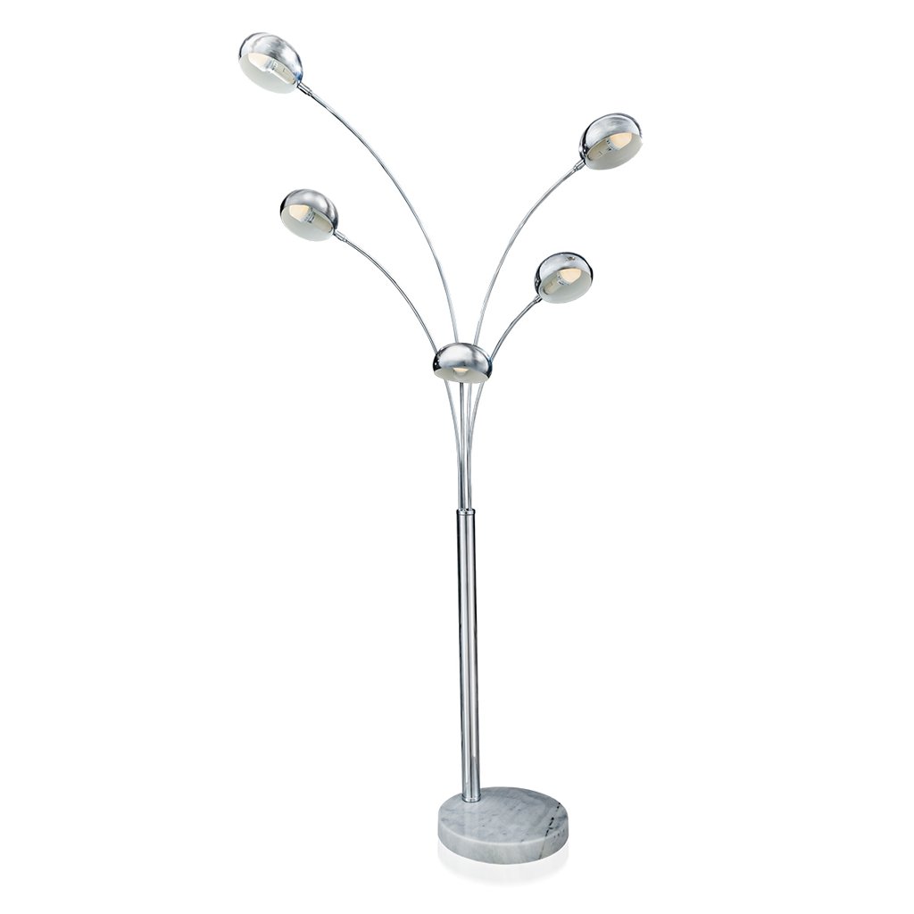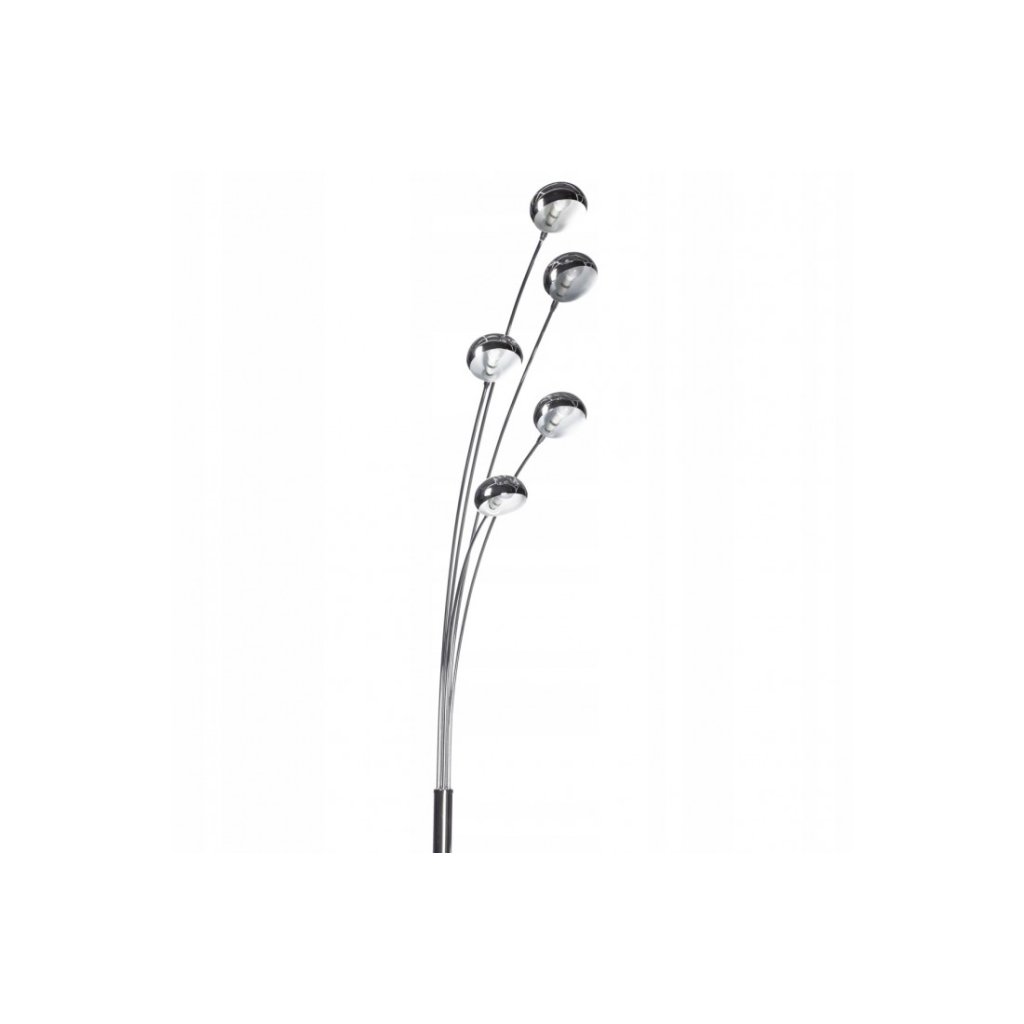 Stojací lampa Palp v leskle chromovém provedení s pěti rameny a oblými stínidly, uvnitř kterých jsou ukryty patice E14 pro žárovky o maximálním příkonu 5 x 40 W (nejsou součástí dodávky). Stabilní kruhová základna má jemný mramorový dekor.