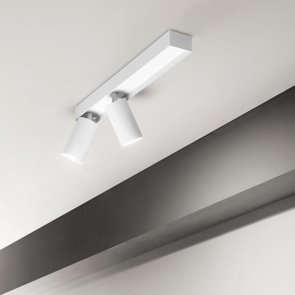 Přisazené bodové svítidlo Ideal Lux PROFILO PL2 314716 v bílé variantě se 2 bodovkami s paticemi GU10 pro spotové žárovky o max. příkonu 2 x 28 W. LED žárovky 2 x 7 W s teplým bílým svitem 3000 K a světelným tokem 2 x 540 lm jsou součástí dodávky. Krytí IP20 pro interiérové použití.