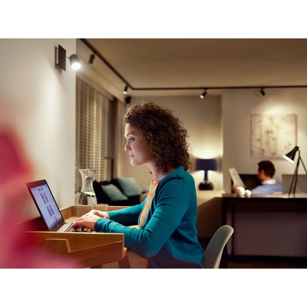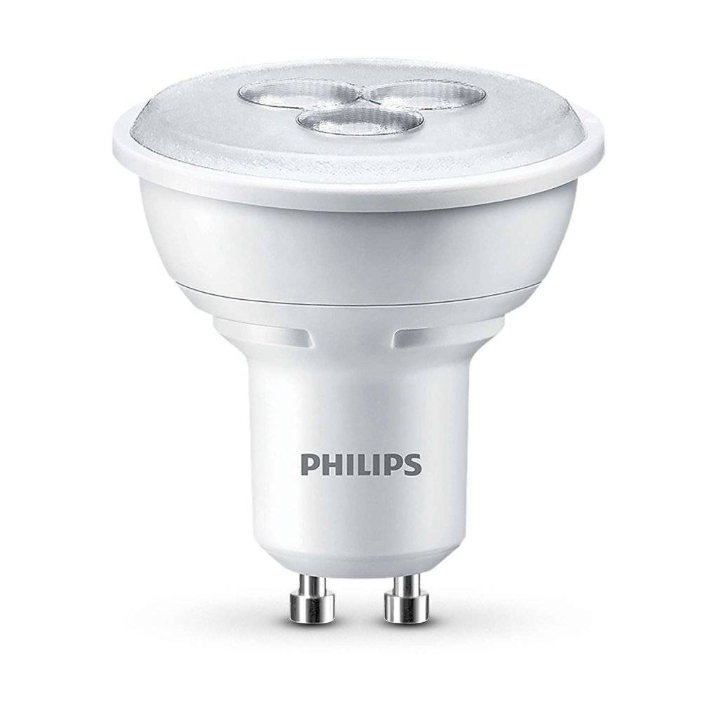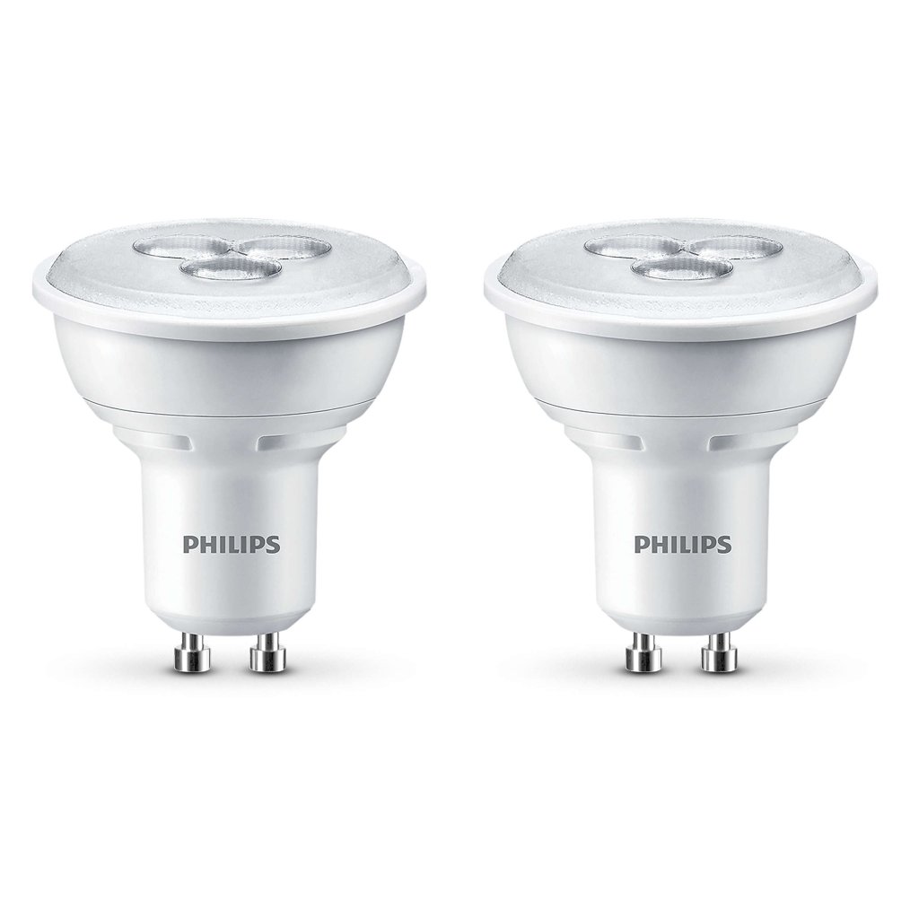 Set 2 ks spotových úsporných LED žárovek Philips s paticemi GU10 o příkonu 2 x 3,5 W, které nahrazují 2 x 35 W halogenové žárovky se světelným tokem 2 x 240 lm v příjemné teplé bílé barvě 2700 K v úhlu svitu 36°.