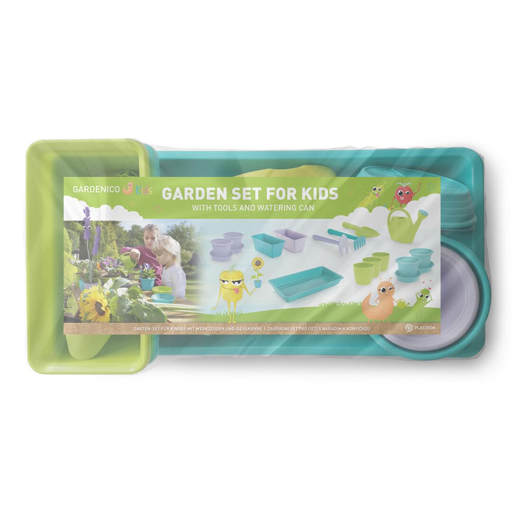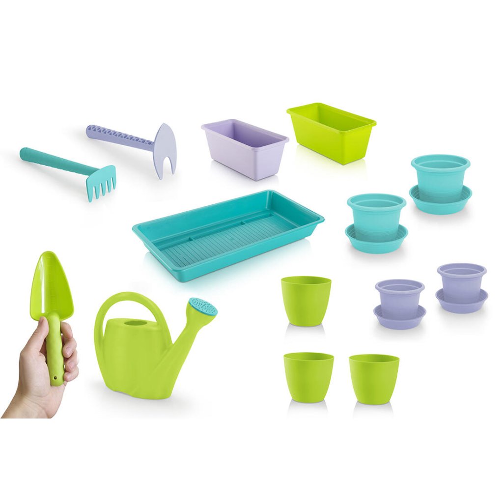 Sada zahradní dětská 14dílná (truhlíky, květináče, konvička, nářadí) PH.Sada obsahuje dětské nářadí, květináče, truhlíky, podmisku a konvičku.