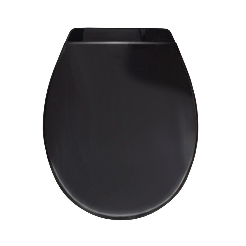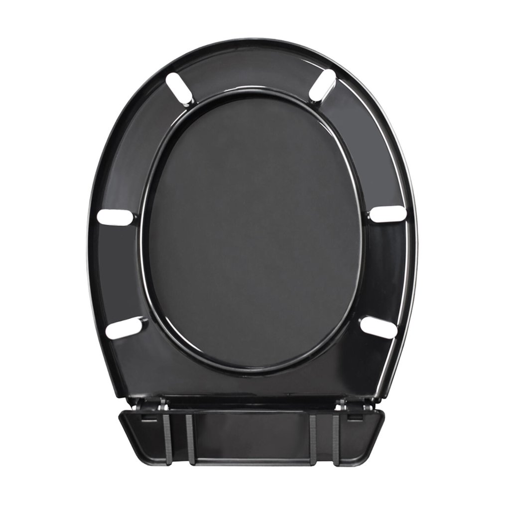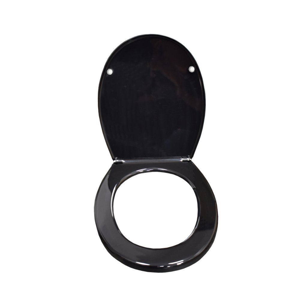 Černé plastové toaletní sedátko má vertikálně a horizontálně nastavitelné držáky, které umožňují snadnou montáž sedátka na většinu toalet.