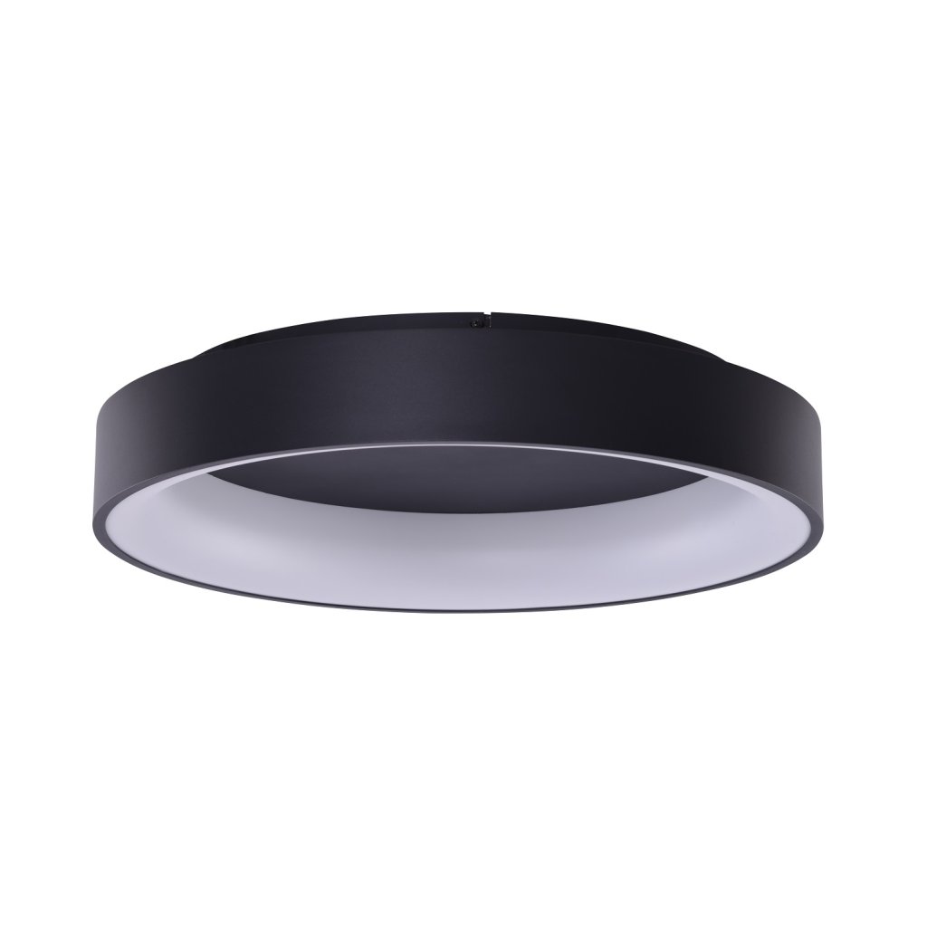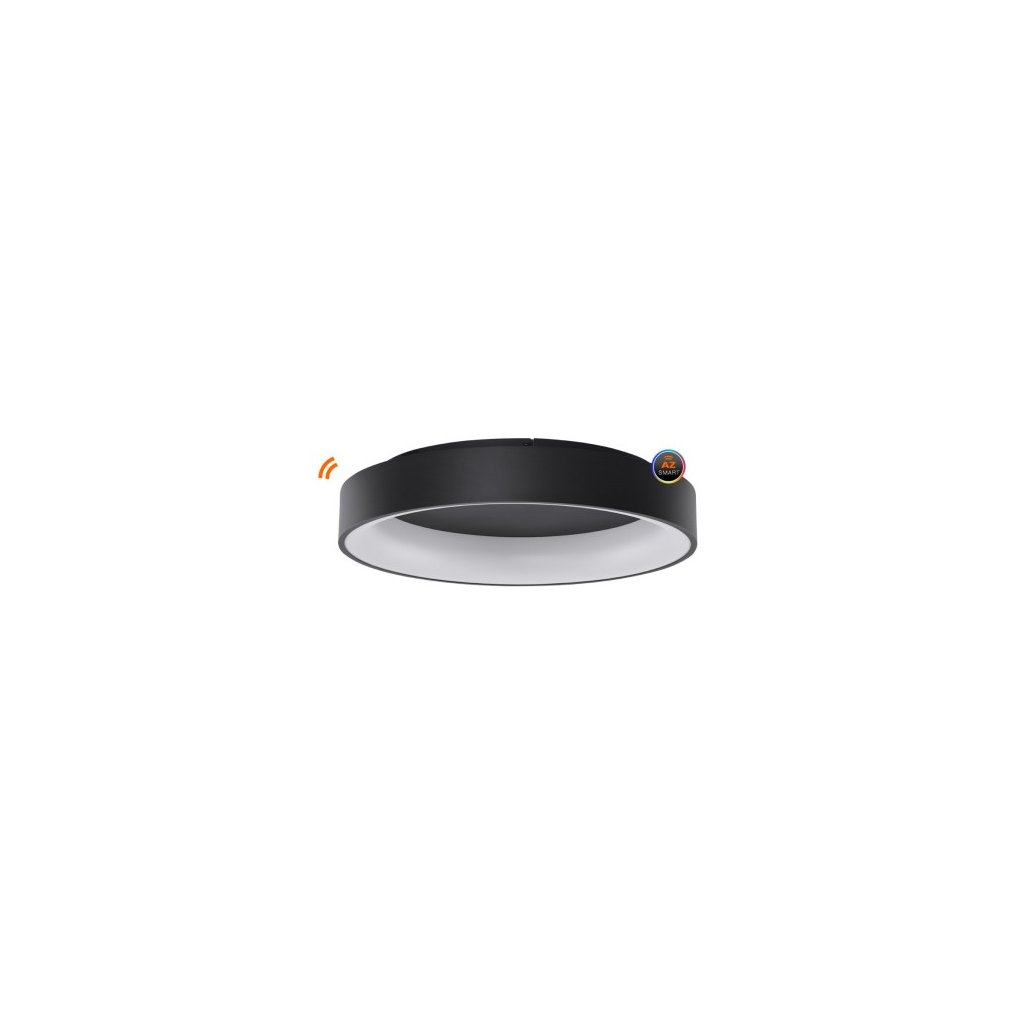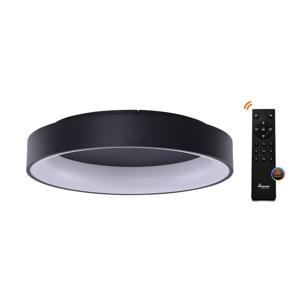 Stropní smart LED svítidlo Solvent R top v největší černé kulaté variantě o průměru 110 cm z kolekce moderního chytrého domácího osvětlení AZzardo Smart svítí stmívatelným úsporným bílým světlem od 3000 K do 6000 K, které lze ovládat aplikací z mobilu.