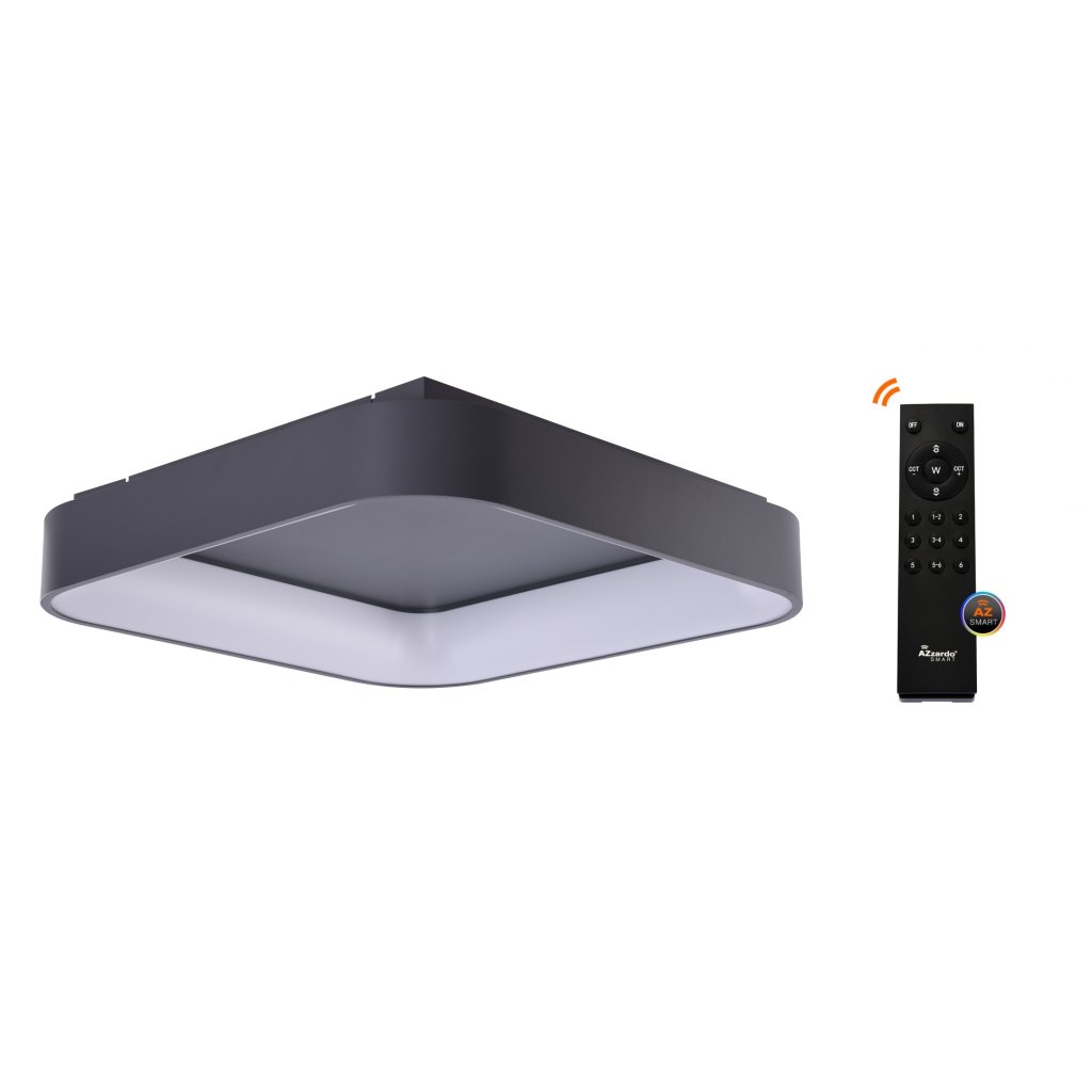 Smart stropní LED svítidlo Solvent S top v elegantní moderním designu v šedé největší hranaté verzi s rozměry 110 x 110 cm z kolekce chytrého domácího osvětlení AZzardo Smart svítí stmívatelným úsporným bílým světlem v rozsahu 3000 K – 6000 K.