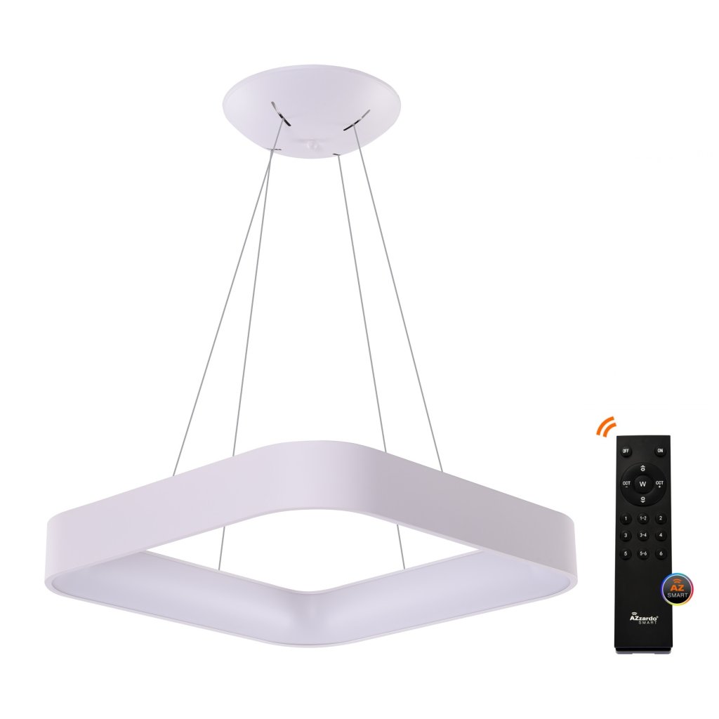 Bílý smart závěsný LED lustr Solvent S v největší hranaté variantě o velikosti 110 x 110 cm z kolekce chytrého domácího osvětlení AZzardo Smart se stmívatelným úsporným bílým světlem v rozsahu 3000 K – 6000 K, které lze ovládat aplikací z vašeho mobilu.