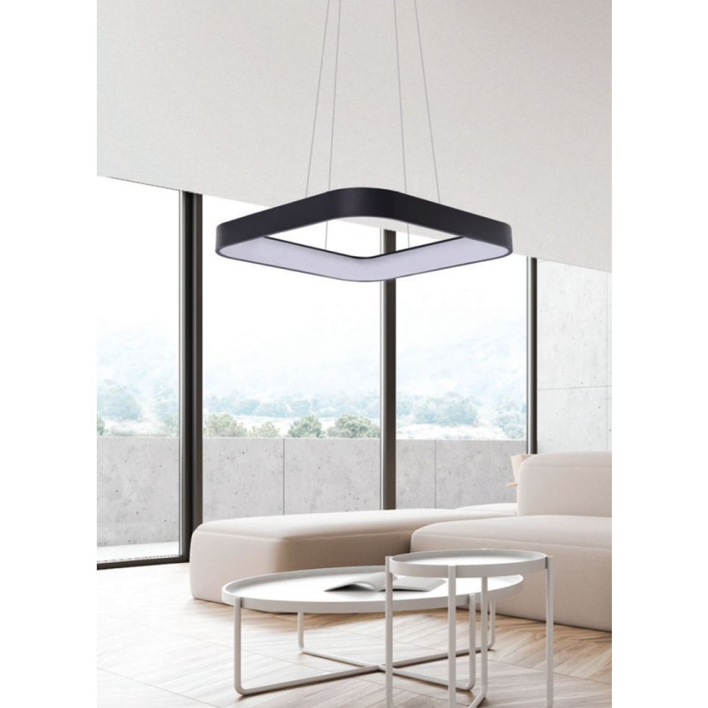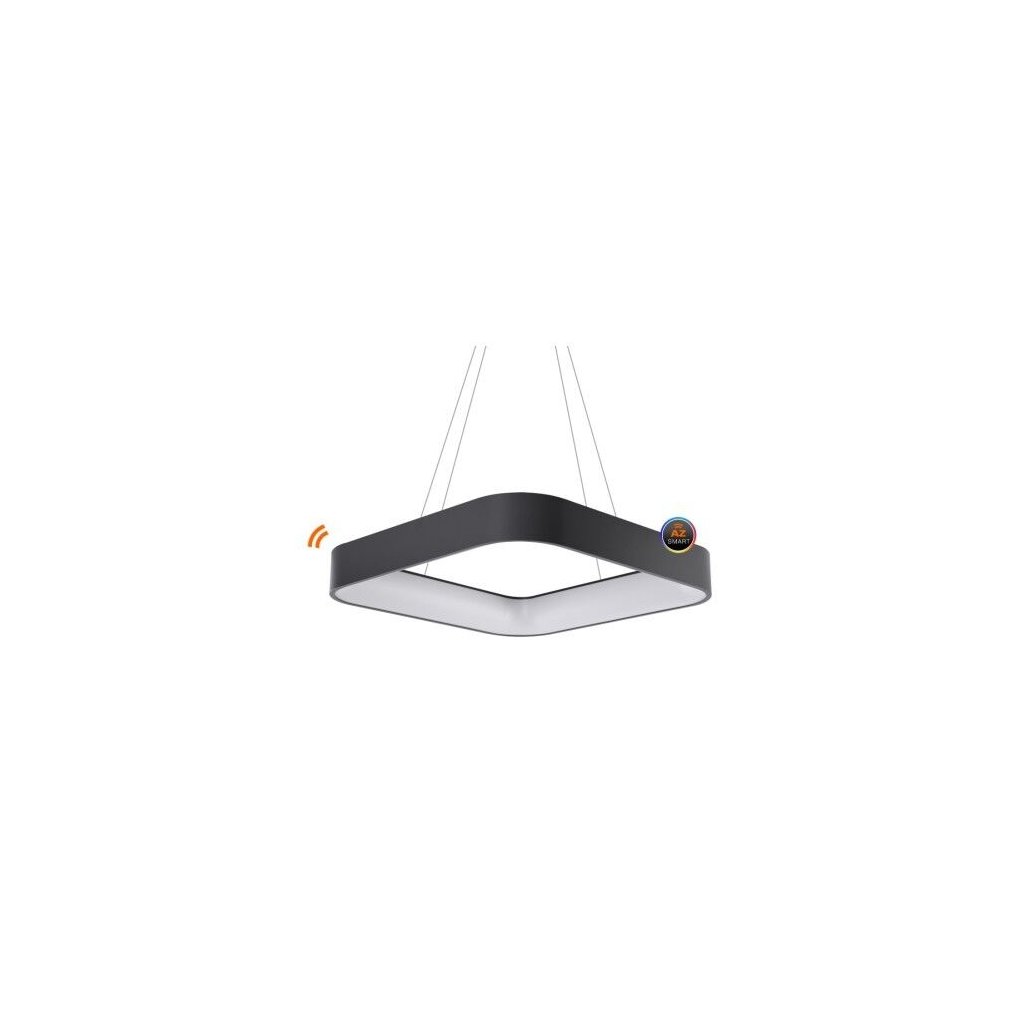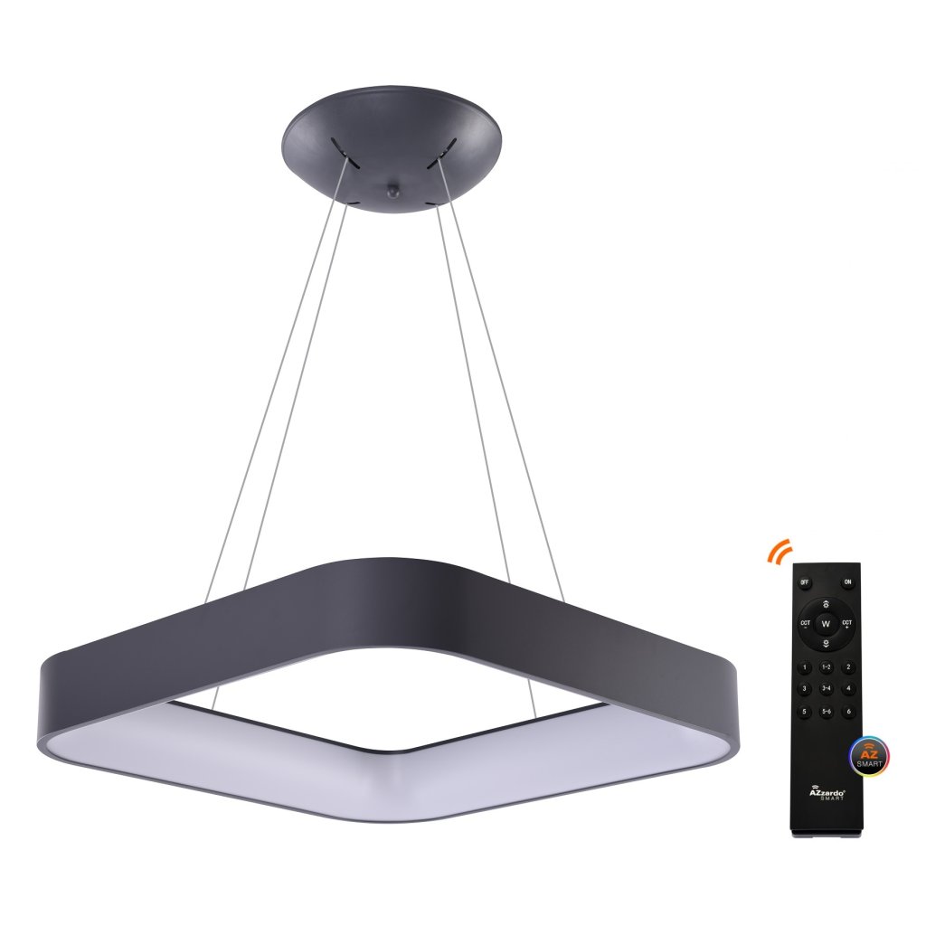 Šedé smart závěsné LED svítidlo Solvent S v největším hranatém provedení o rozměrech 110 x 110 cm z kolekce chytrého domácího osvětlení AZzardo Smart se stmívatelným úsporným bílým světlem v rozsahu 3000 K – 6000 K, které lze ovládat aplikací z mobilu.