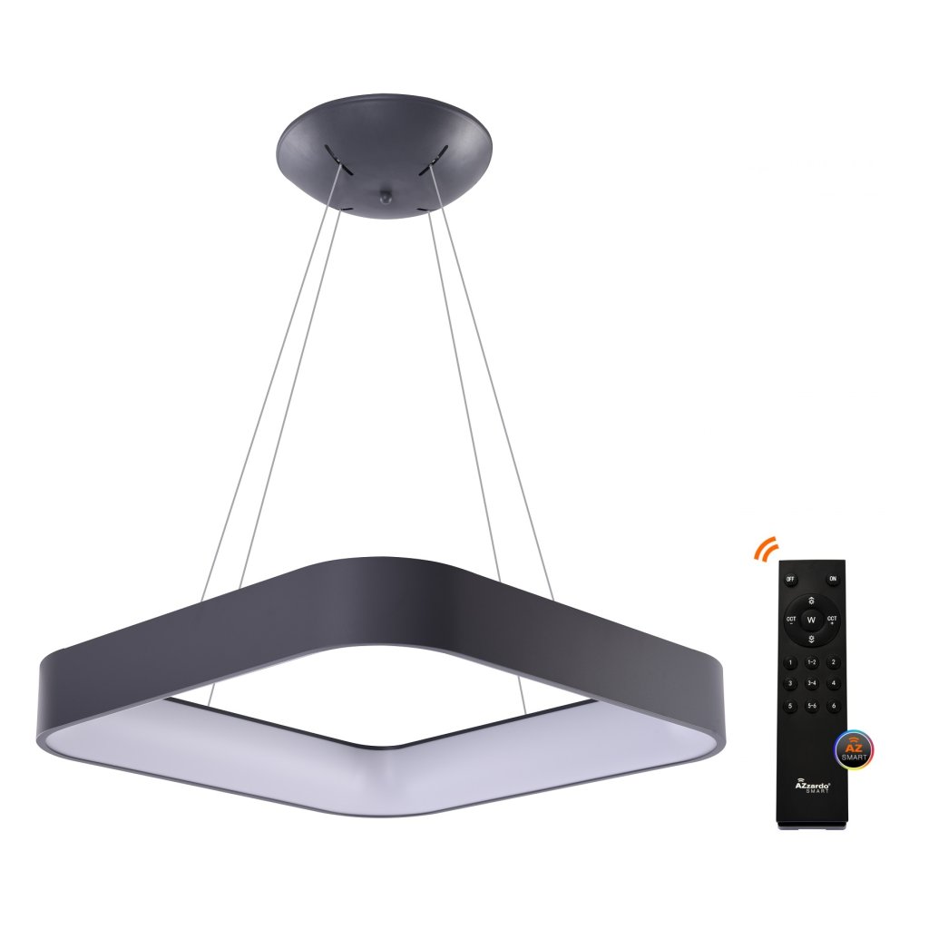 Hranaté smart LED závěsné svítidlo Solvent S v šedé barvě o velikosti 60 cm x 60 cm z kolekce chytrého domácího osvětlení AZzardo Smart se stmívatelným úsporným bílým světlem v rozsahu 3000 K – 6000 K, které lze ovládat aplikací ve vašem smartphonu.