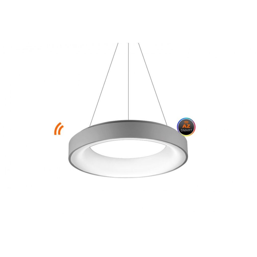 Smart závěsný LED lustr Sovana Pendant ve větší šedé verzi o průměru 55 cm z kolekce moderního chytrého domácího osvětlení AZzardo Smart svítí stmívatelným úsporným bílým světlem v rozsahu 3000 K – 6000 K, které lze ovládat aplikací z chytrého telefonu.