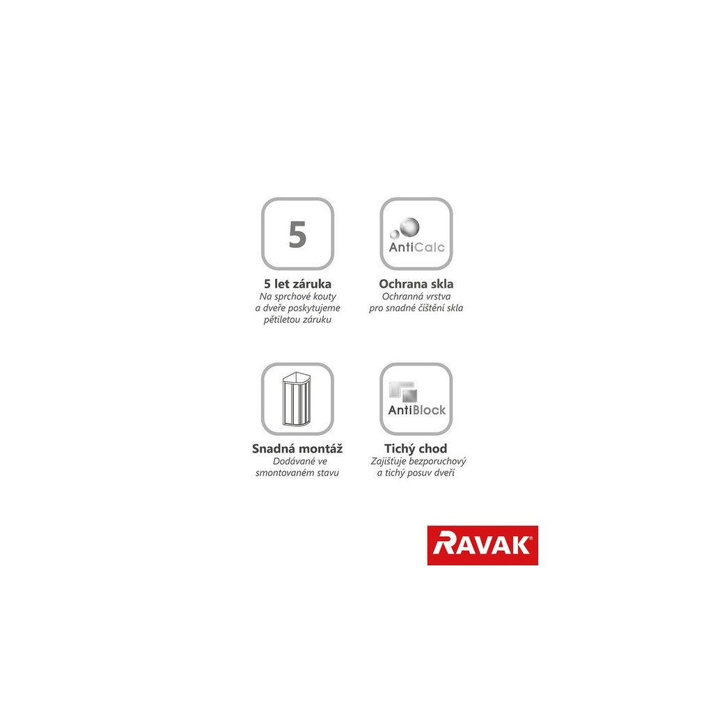 K vytvoření celého koutu jsou zapotřebí dva kusy posuvných dveří ASRV3, rohový spoj je součástí každého balení. Kombinací různých rozměrů obou dílů získáme čtvercovou nebo obdélníkovou variantu koutu (např. 75 x 90 cm, 80 x 90 cm atd.). Montuje se do obloženého rohu koupelny na vaničky RAVAK Aneta, Angela, Perseus, Perseus Pro, Perseus Pro Flat, Perseus Pro Chrome, Perseus Pro 10° nebo přímo na podlahu se zabudovaných odtokovým žlabem či podlahovou vpustí. Sprchový kout je možno přizpůsobit případným nepřesnostem stavebního otvoru pomocí nastavovacích profilů NPS.