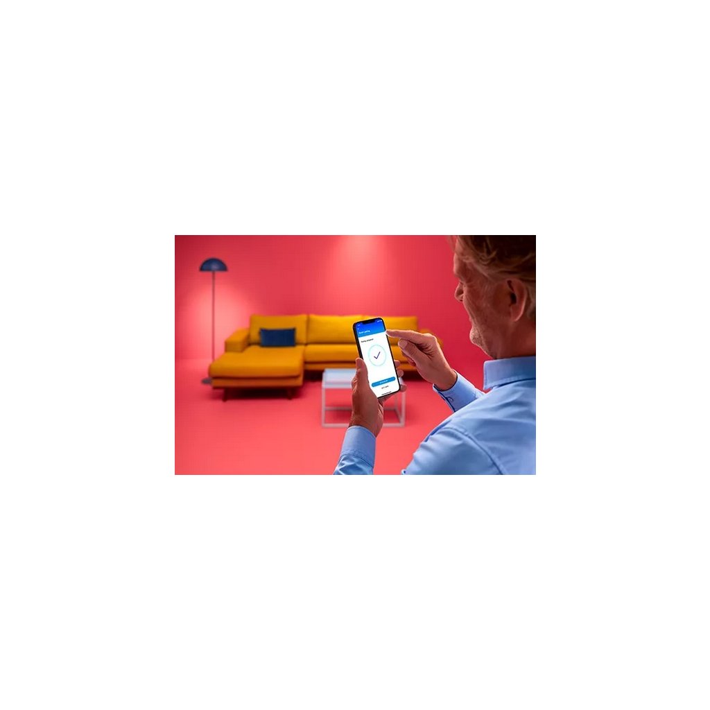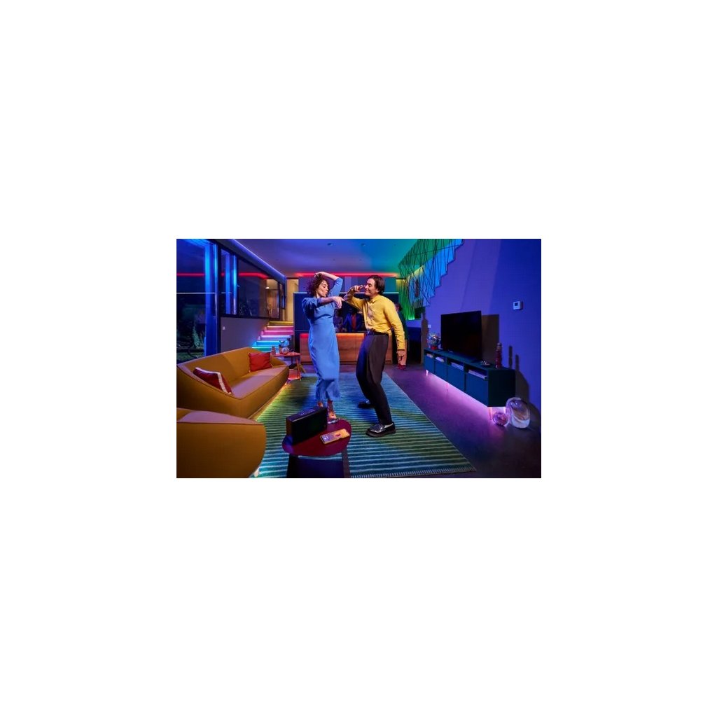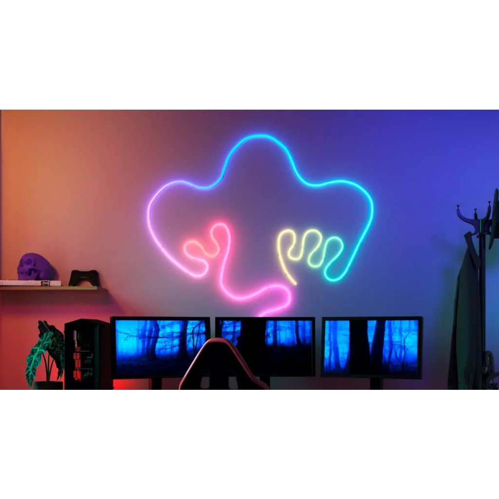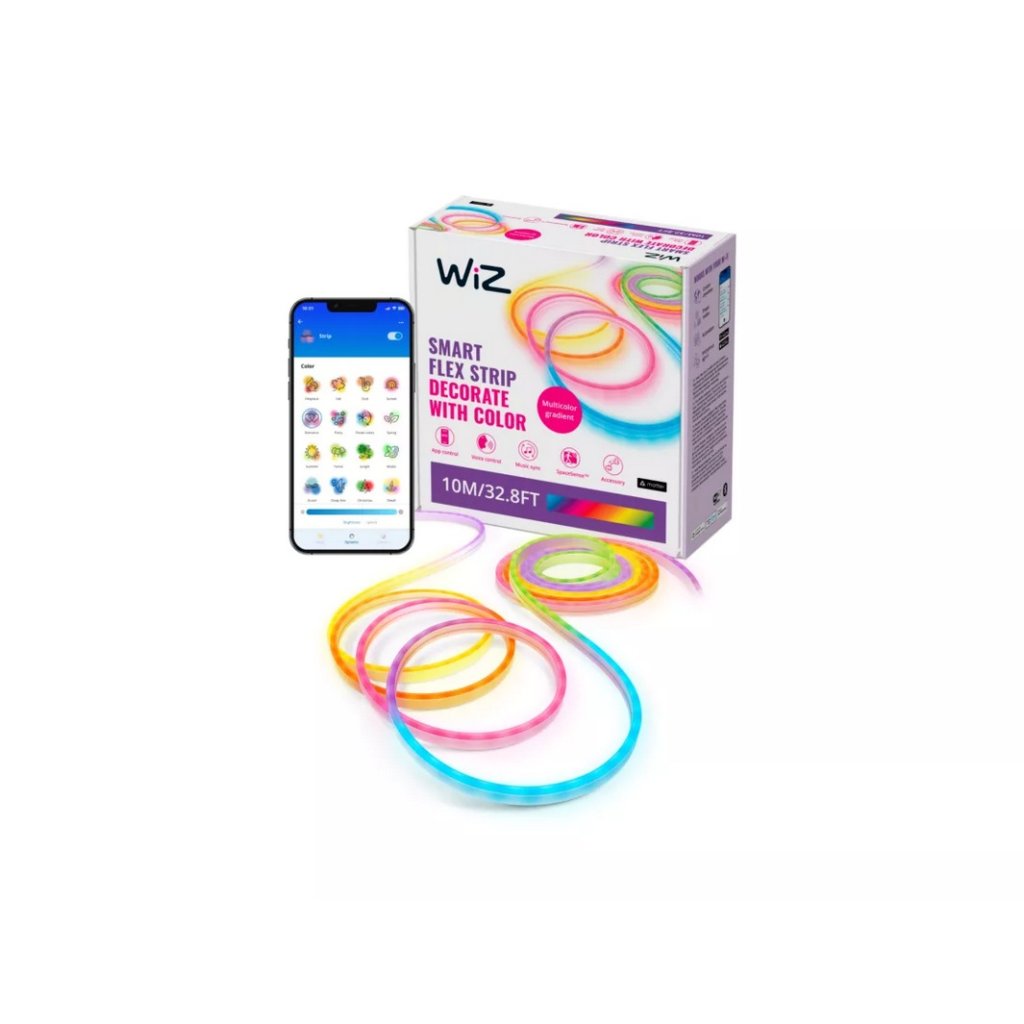Interiérový chytrý LED pásek WiZ NEON RGBIC v délce 10 m s integrovanými LED diodami o celkovém příkonu 45 W s barevným stmívatelným světlem, které lze ovládat mobilní aplikací Matter nebo dálkovým ovládáním WiZ (není součástí balení).
