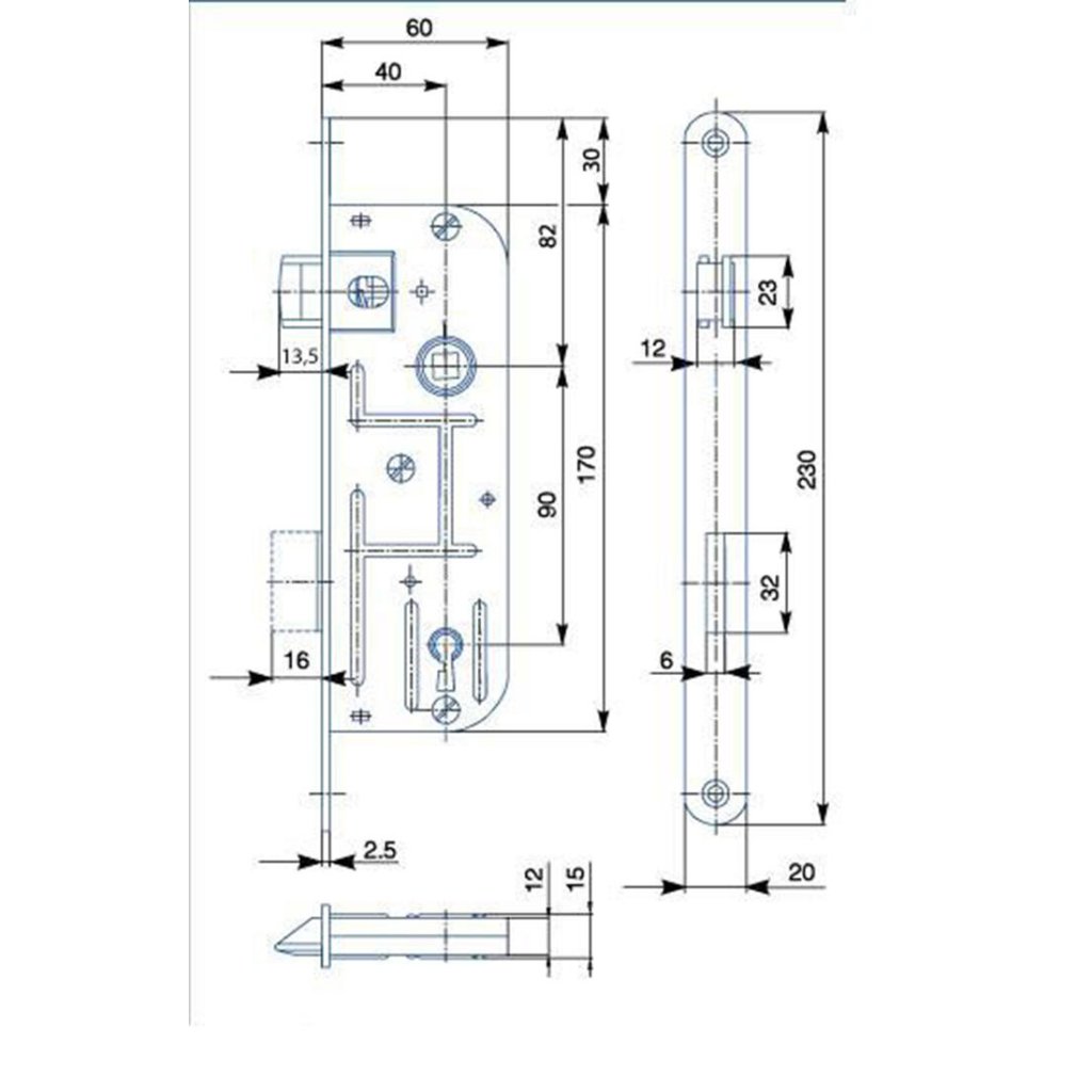 Zadlabací dozický zámek 02-03 jednozápadový bez převodu s otvory pro dělené štíty je univerzální na pravé i levé dveře.