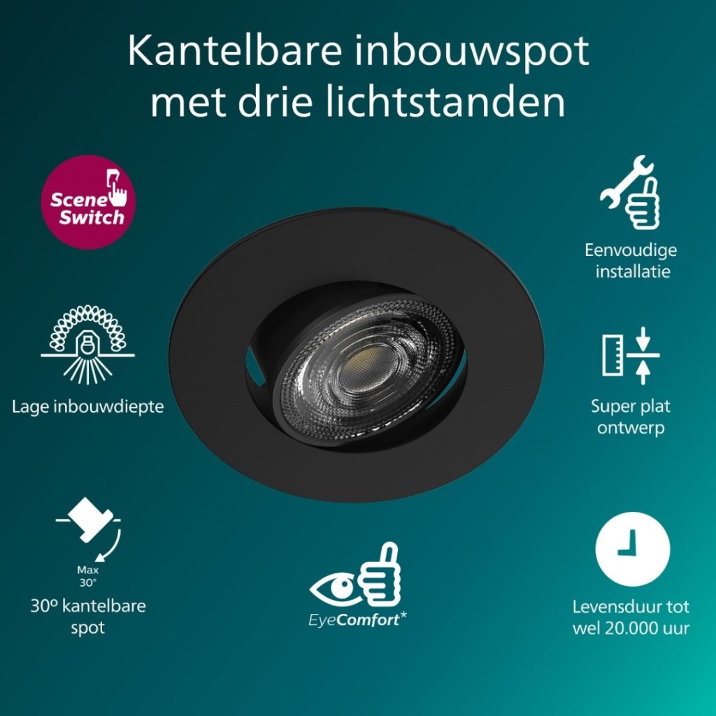 Zápustné bodové LED svítidlo Philips Cilantro Step v černé barvě s možným stmíváním ve 3 intenzitách pomocí klasického nástěnného vypínače. Svítí jasným neutrálním denním bílým světlem 4000 K, které vychází z integrovaných LED diod o příkonu 5 W se světelným tokem 550 lm. Interiérové krytí IP20.